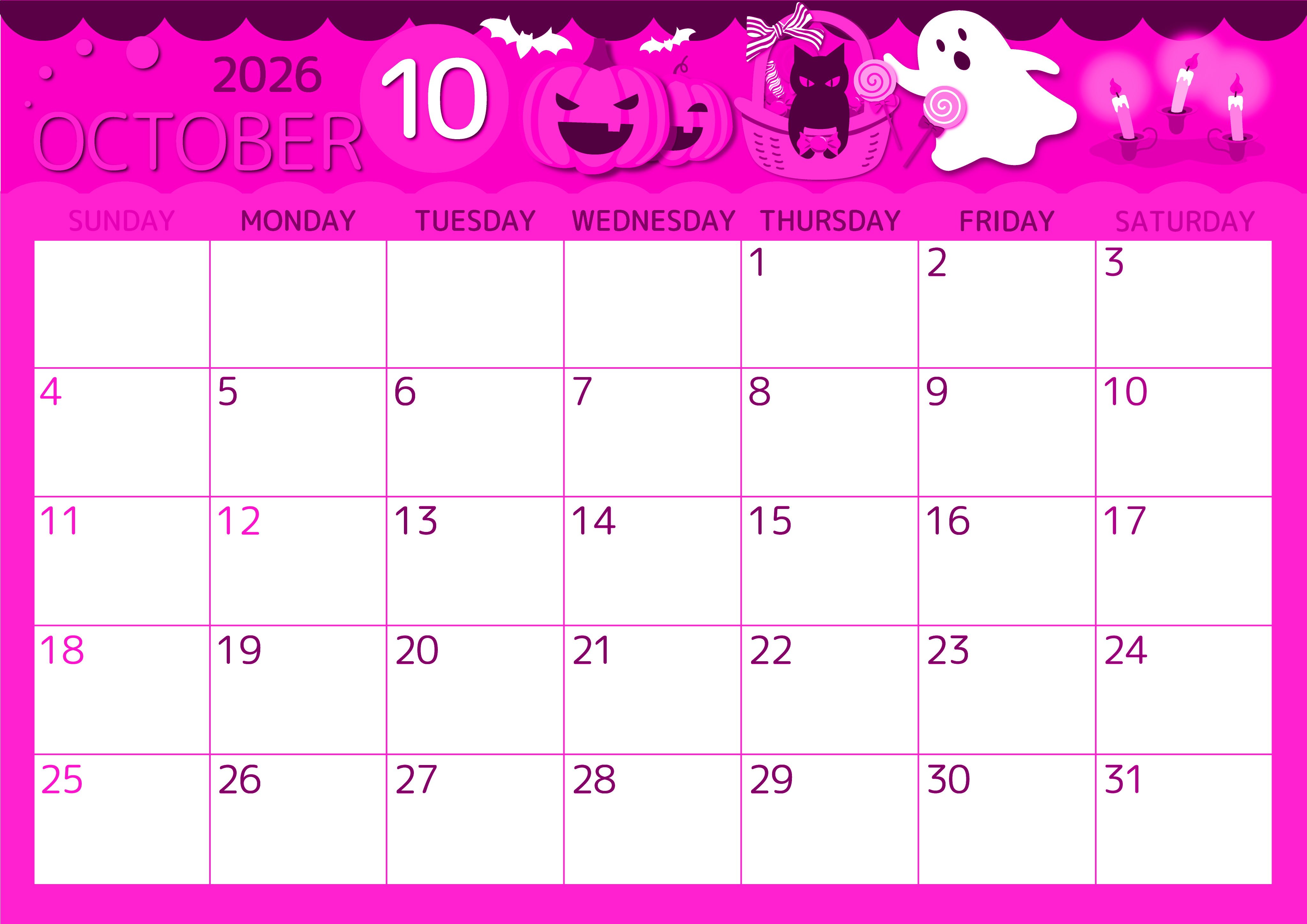 2026年10月横型日曜始まりの無料テンプレートピンクのカレンダーです。行事をテーマに盛り沢山なアイテムをぎっしり詰め込んだイラストに心を踊らされます。かわいいだけでなく実用性の高いレイアウトです。(2026-00811000)