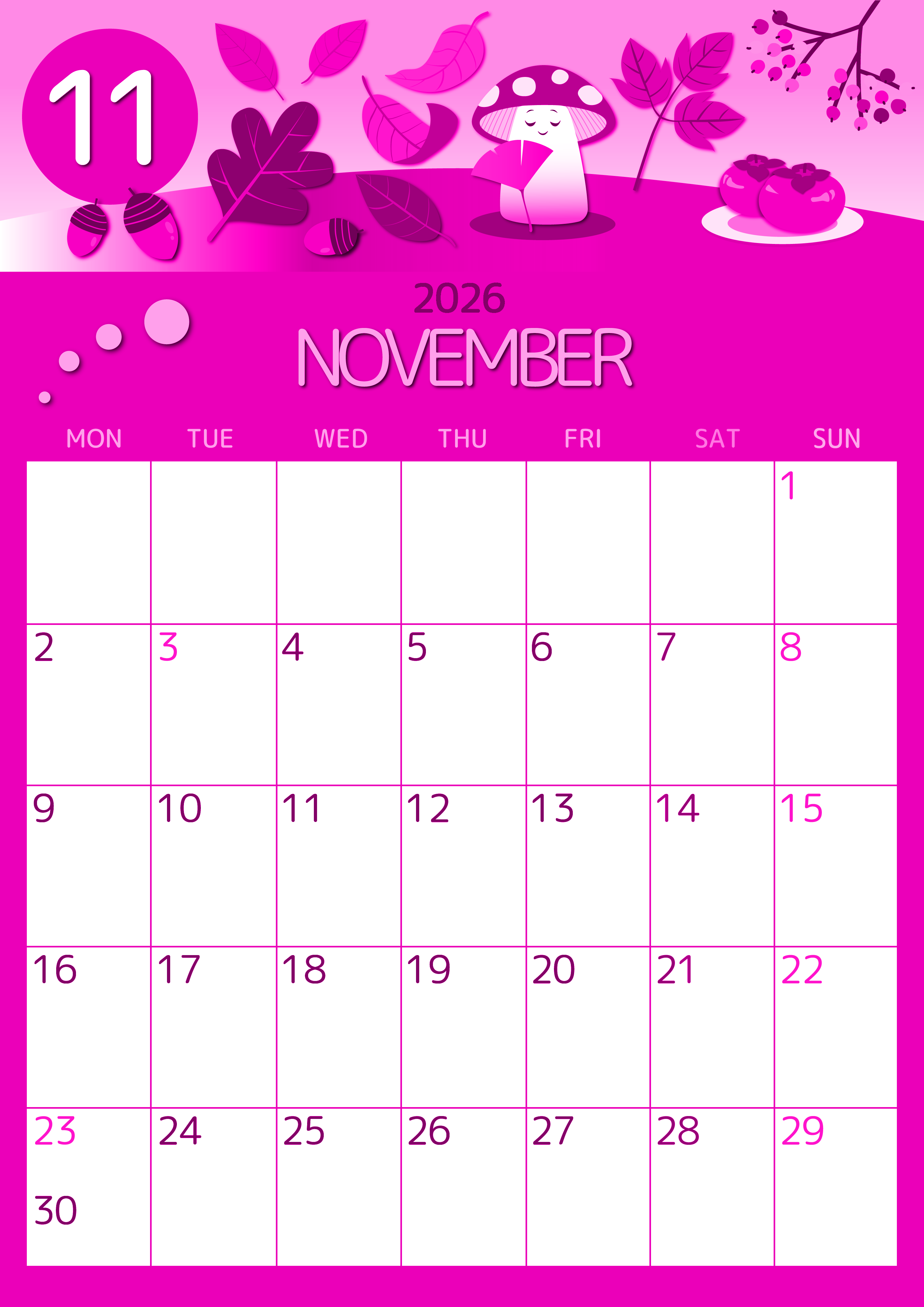 2026年・無料のカレンダーテンプレート 2026年11月縦型月曜始まり きのこイラストのかわいいA4無料ピンクのカレンダー(2026-00811111) 素材状デザイン王 2025年4月3日 2026年11月縦型月曜始まりの無料テンプレートピンクのカレンダーです。数字が丸っこくて細い線なので騒がしくなく見やすいです。きのこのイラストがワンポイントでかわいいのでおすすめです。(2026-00811111) 11月 縦型のカレンダー 月曜始まり ピンク カレンダーデザイン-0081