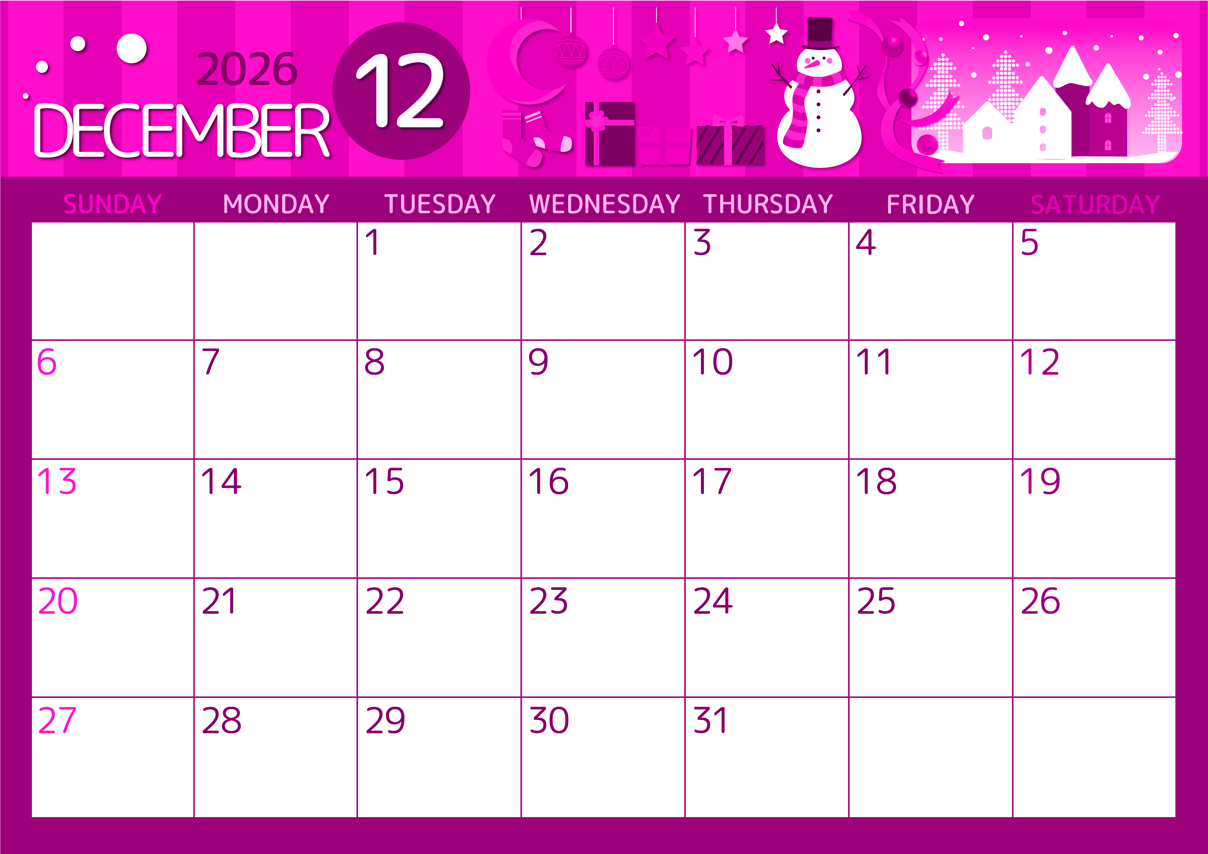 2026年・無料のカレンダーテンプレート 2026年12月横型日曜始まり 雪だるまイラストのかわいいA4無料ピンクのカレンダー(2026-00811200) 素材状デザイン王 2025年4月3日 2026年12月横型日曜始まりの無料テンプレートピンクのカレンダーです。雪だるまが主役のイラストです。ピンクのカレンダー上部は鮮やかな赤色でコントラストがかわいいです。(2026-00811200) 12月 横型のカレンダー 日曜始まり ピンク カレンダーデザイン-0081
