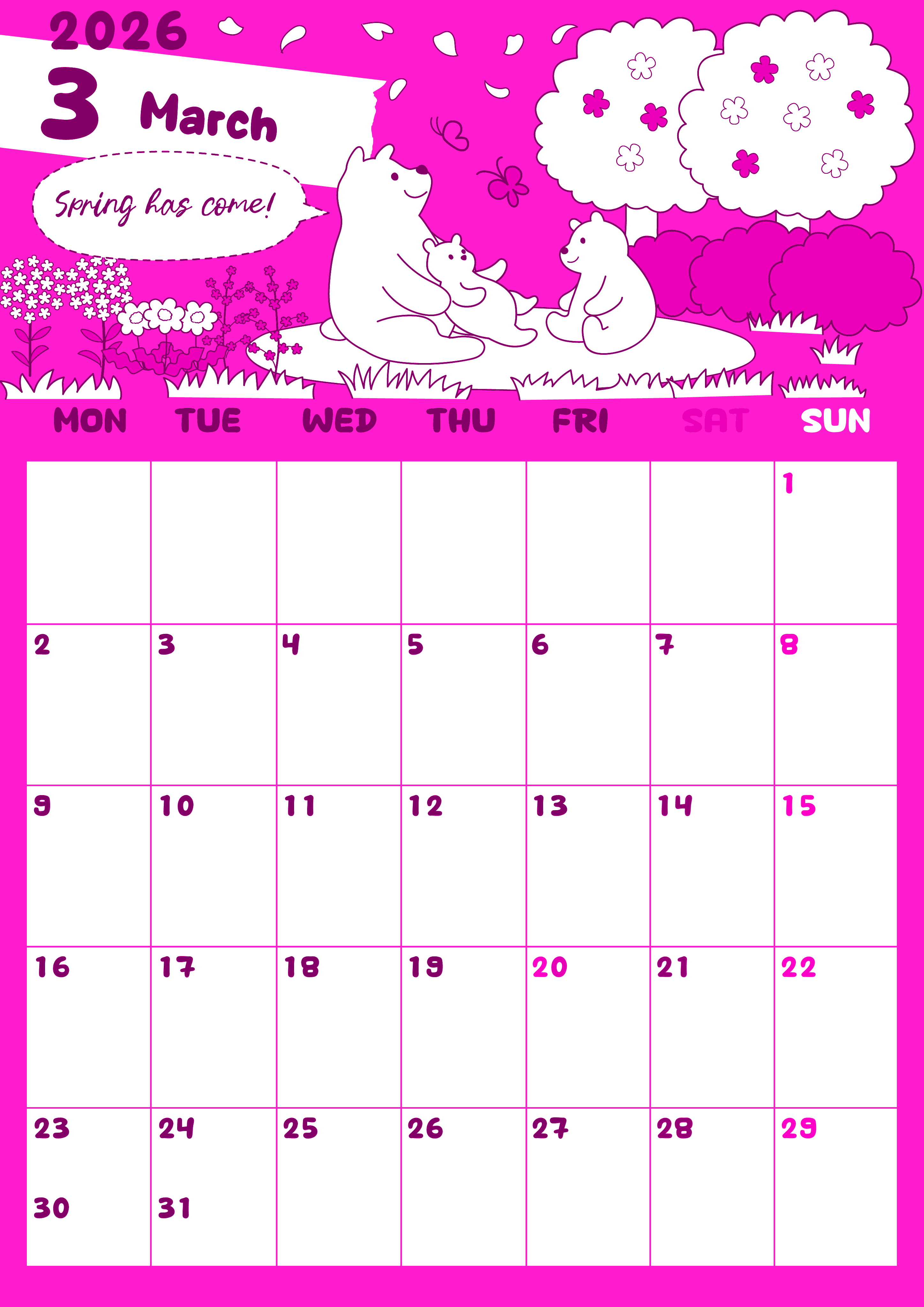 2026年3月縦型月曜始まりの無料テンプレートピンクのカレンダーです。月曜始まりなので行事の把握をするのにぴったりなイラストピンクのカレンダーです。白熊のポップなイラストもかわいいので使っていてワクワクします。(2026-00820311)
