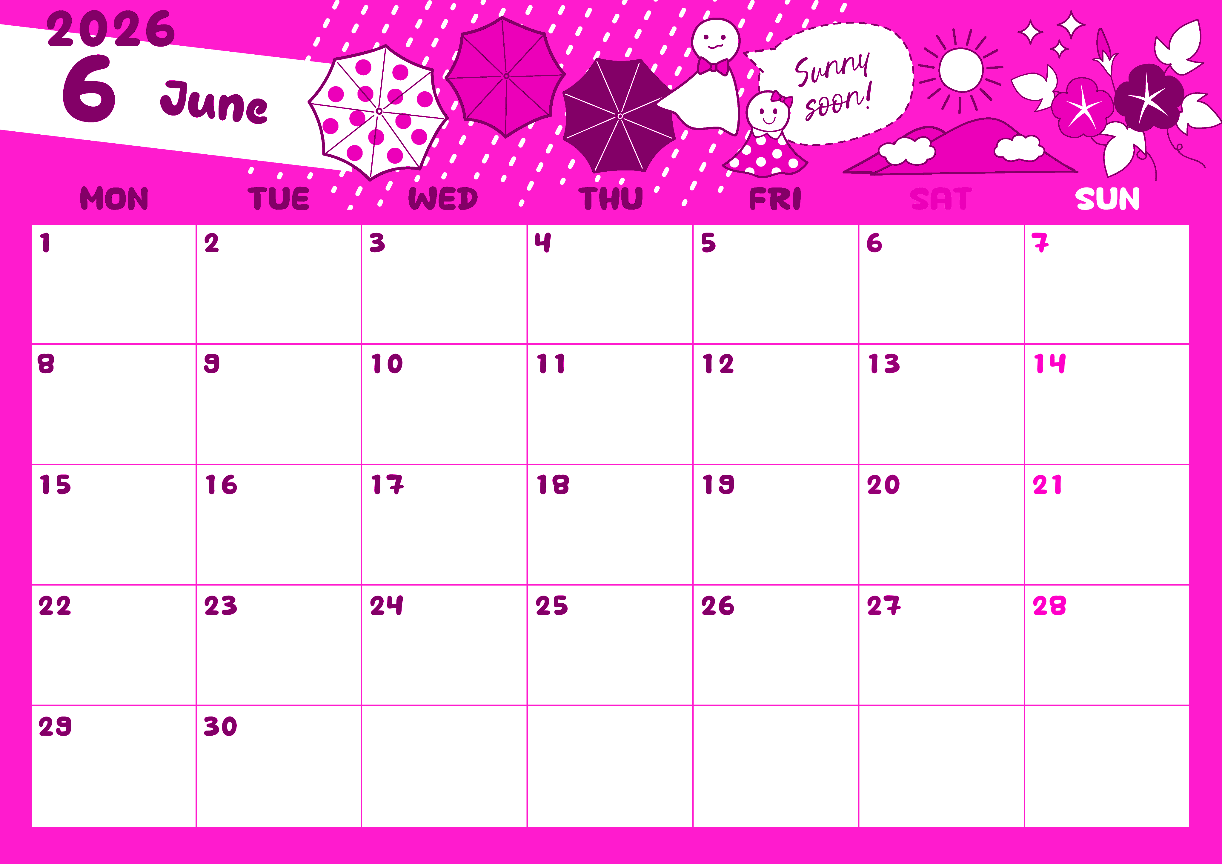 2026年6月横型月曜始まりの無料テンプレートピンクのカレンダーです。月曜始まりピンクのカレンダーが好きな人に適しています。季節の風物詩となるてるてる坊主や傘や朝顔というバラエティ豊かなポップでかわいいイラストが敷き詰められています。(2026-00820601)