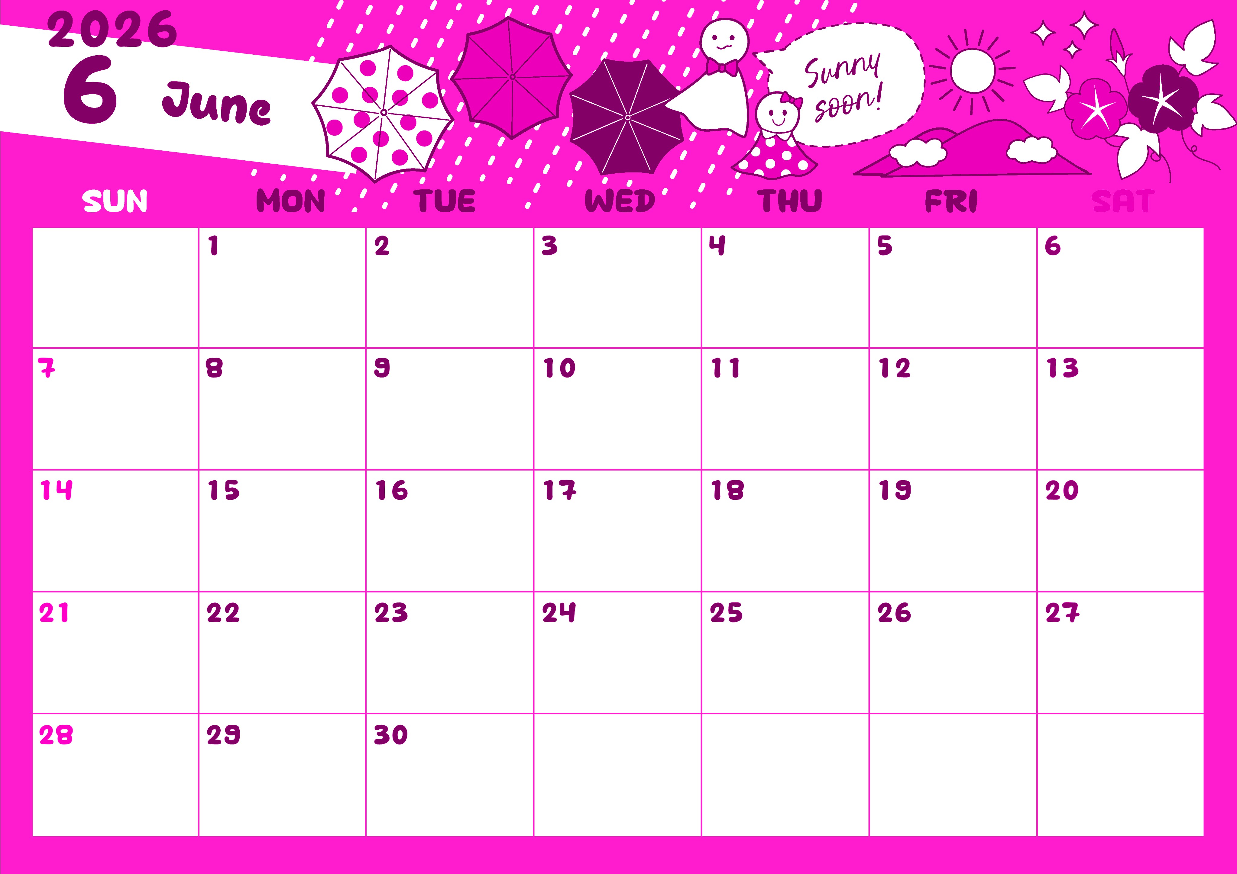 2026年6月横型日曜始まりの無料テンプレートピンクのカレンダーです。てるてる坊主や朝顔やパラソルといった6月の季節感をまとったフレームのポップでかわいいピンクのカレンダーです。イラストも丁寧に描かれています。(2026-00820600)