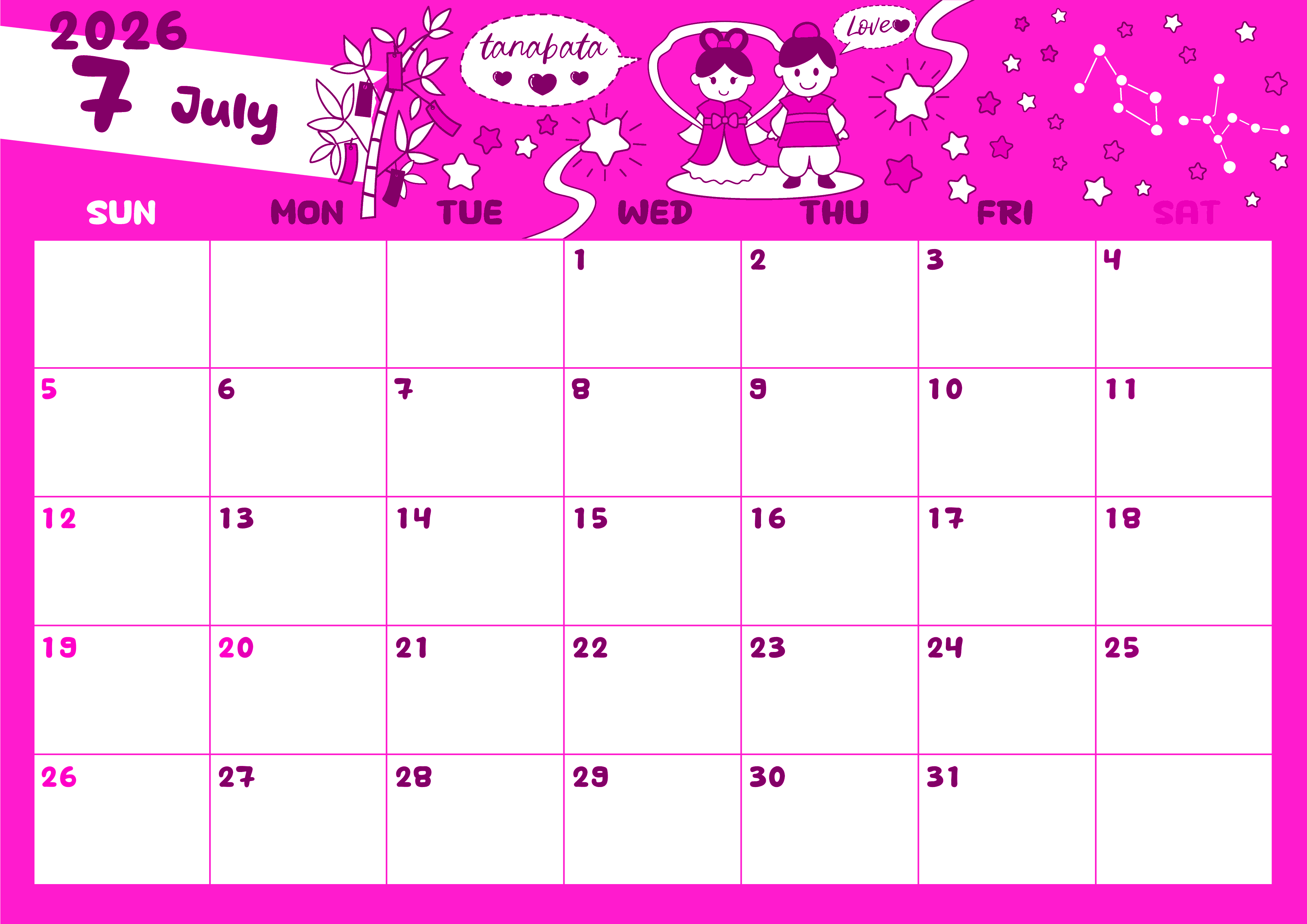 2026年7月横型日曜始まりの無料テンプレートピンクのカレンダーです。フレームにスケジュールを書き込む部分は白紙で実用性が極めて高いピンクのカレンダー素材です。イラストも完成度が高くてポップテイストでとてもかわいい無料とは思えない出来です。(2026-00820700)