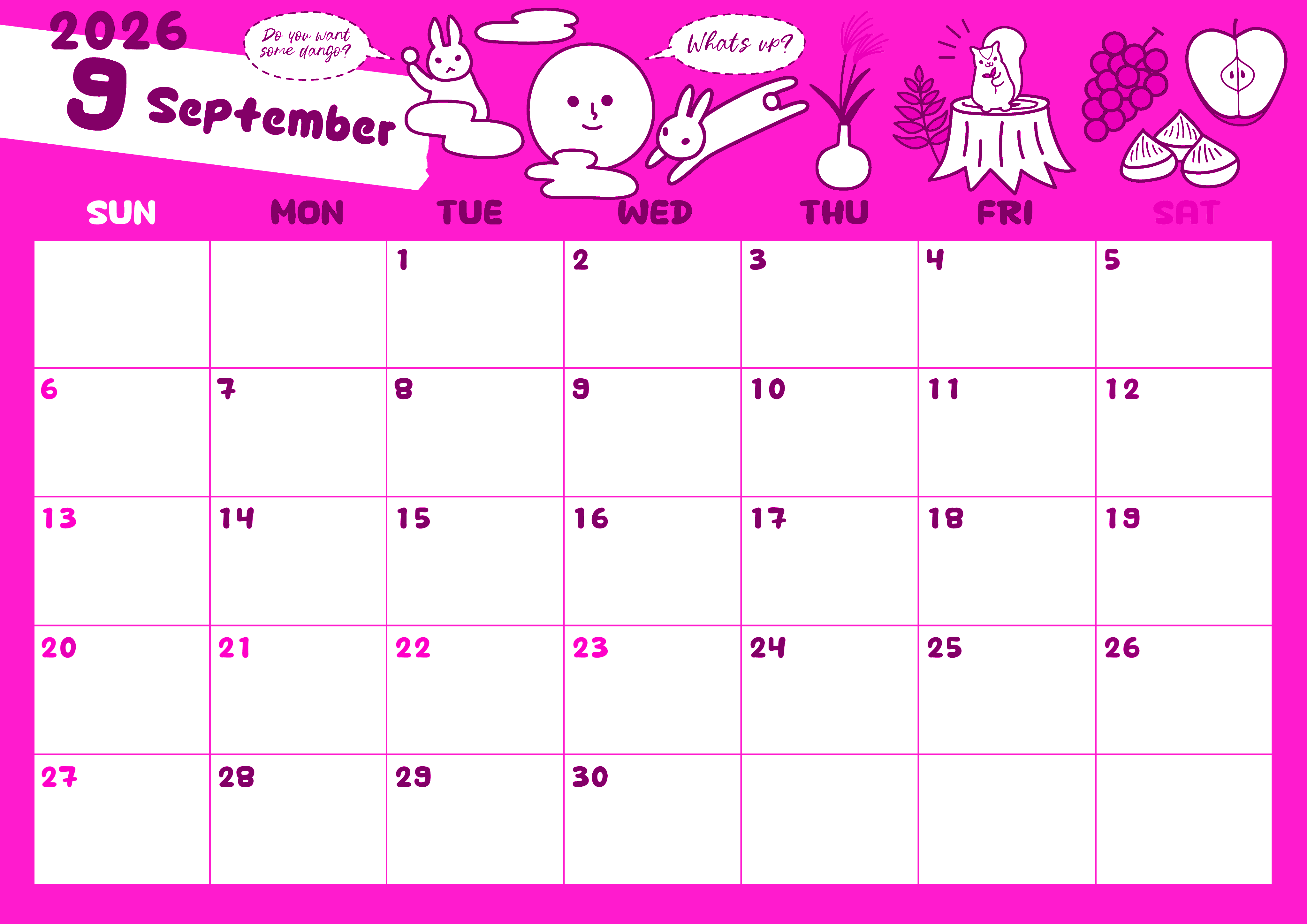 2026年9月横型日曜始まりの無料テンプレートピンクのカレンダーです。ポップなテイストでユーモアも盛り込んでいるコミカルでかわいい森の動物たちがあちこちで戯れているイラストのA4サイズピンクのカレンダーとなっています。(2026-00820900)
