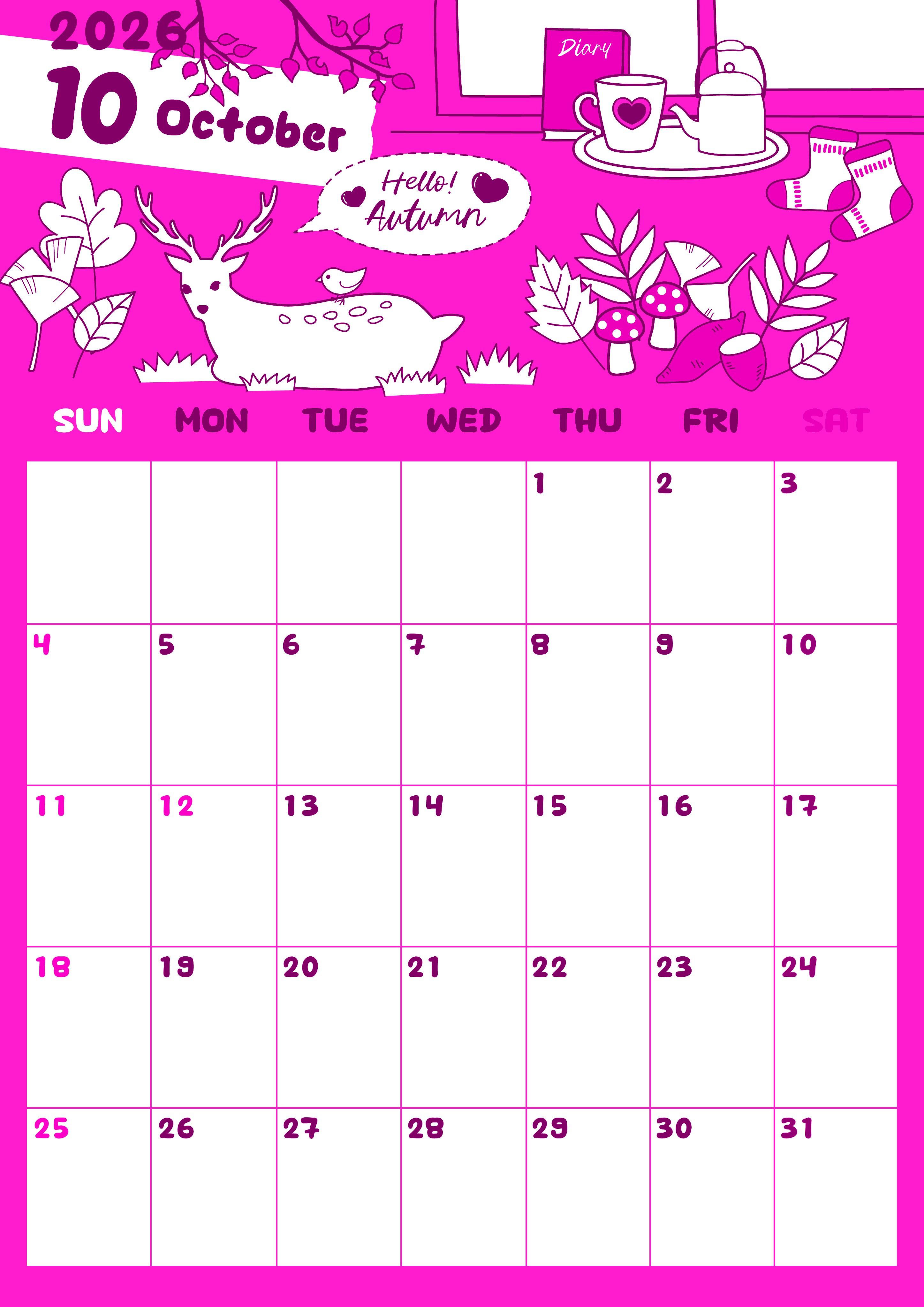 2026年10月縦型日曜始まりの無料テンプレートピンクのカレンダーです。鹿ののんびりしている様子に癒されるかわいいイラストです。忙しい10月のスケジュールを整理整頓するのに向いている見やすいレイアウトです。(2026-00821010)