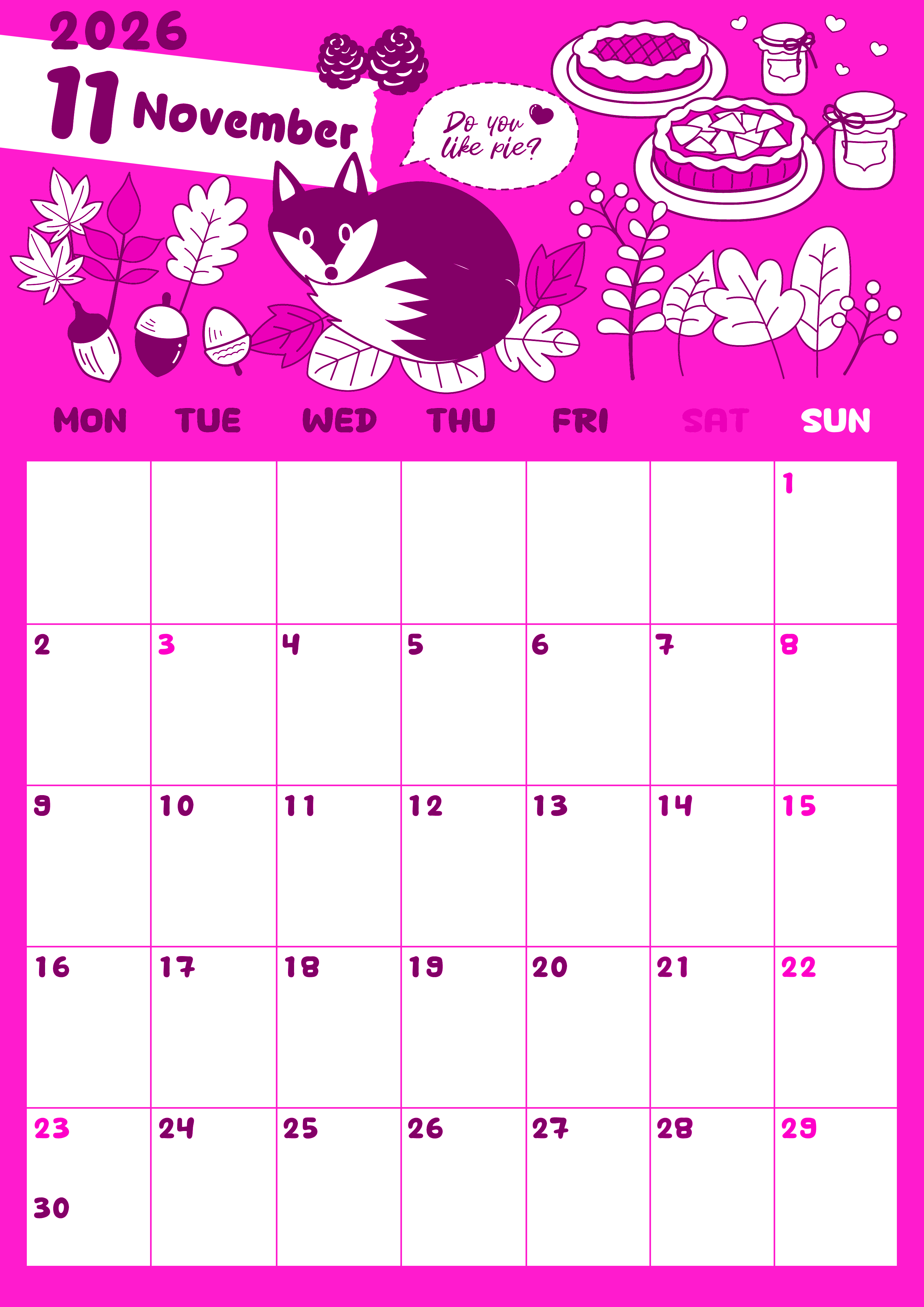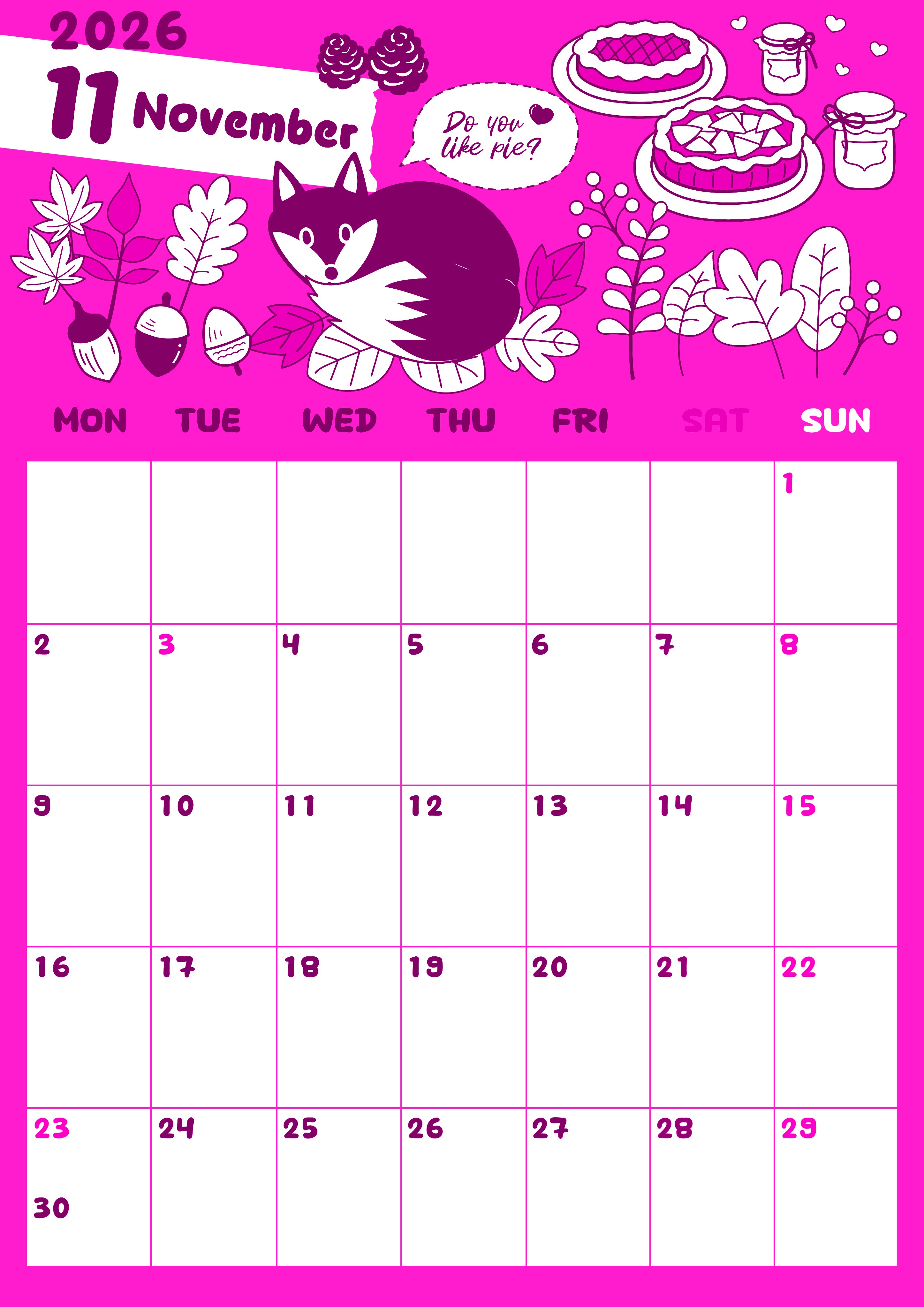 2026年11月縦型月曜始まりの無料テンプレートピンクのカレンダーです。ホカホカの出来立てのアップルパイがおいしそうなかわいいイラストが目を引きます。食欲の秋を計画的に過ごすのに積極的にご活用下さい。(2026-00821111)