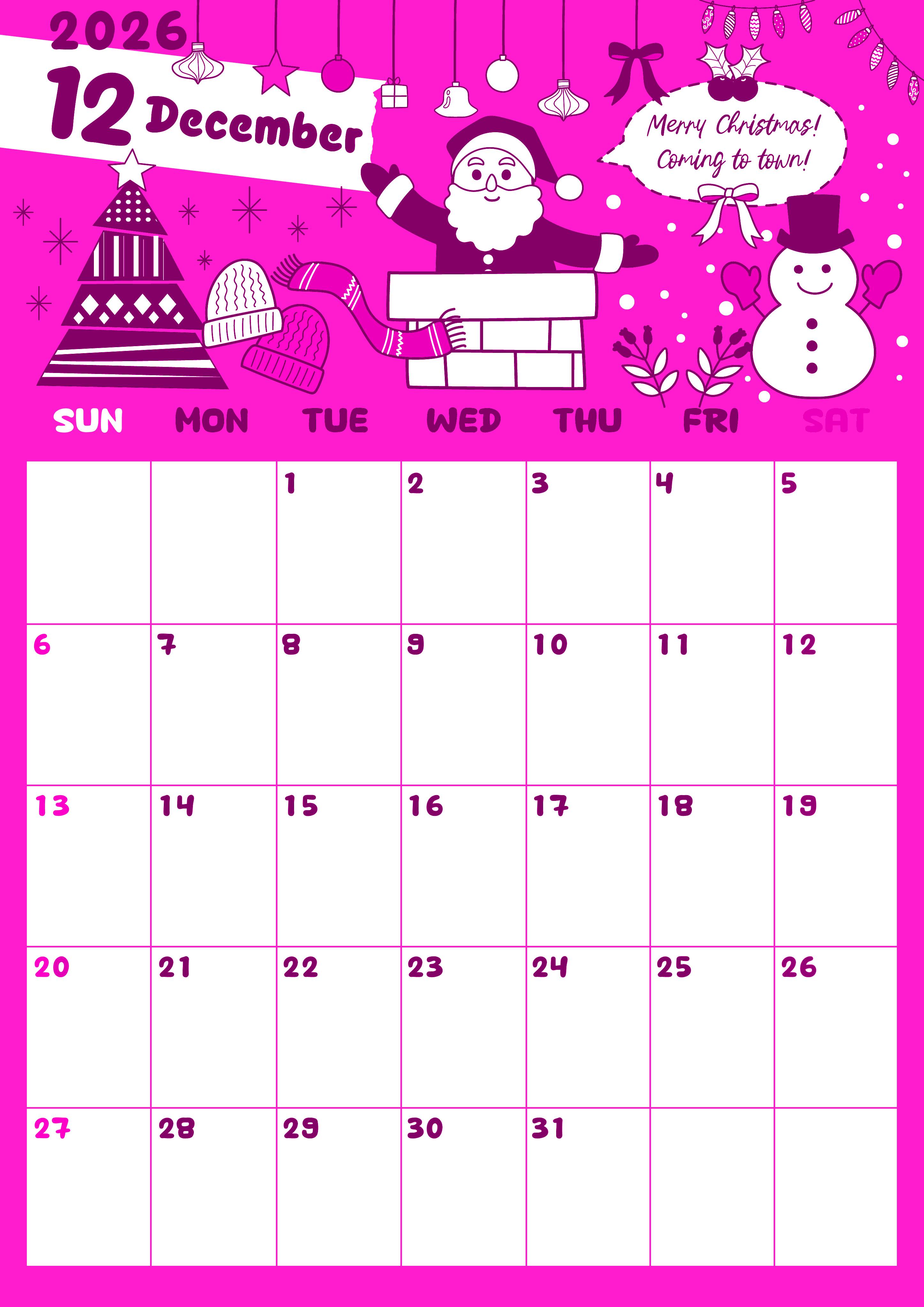 2026年12月縦型日曜始まり サンタのイラストがかわいいA4無料ピンクのカレンダー(2026-00821210)