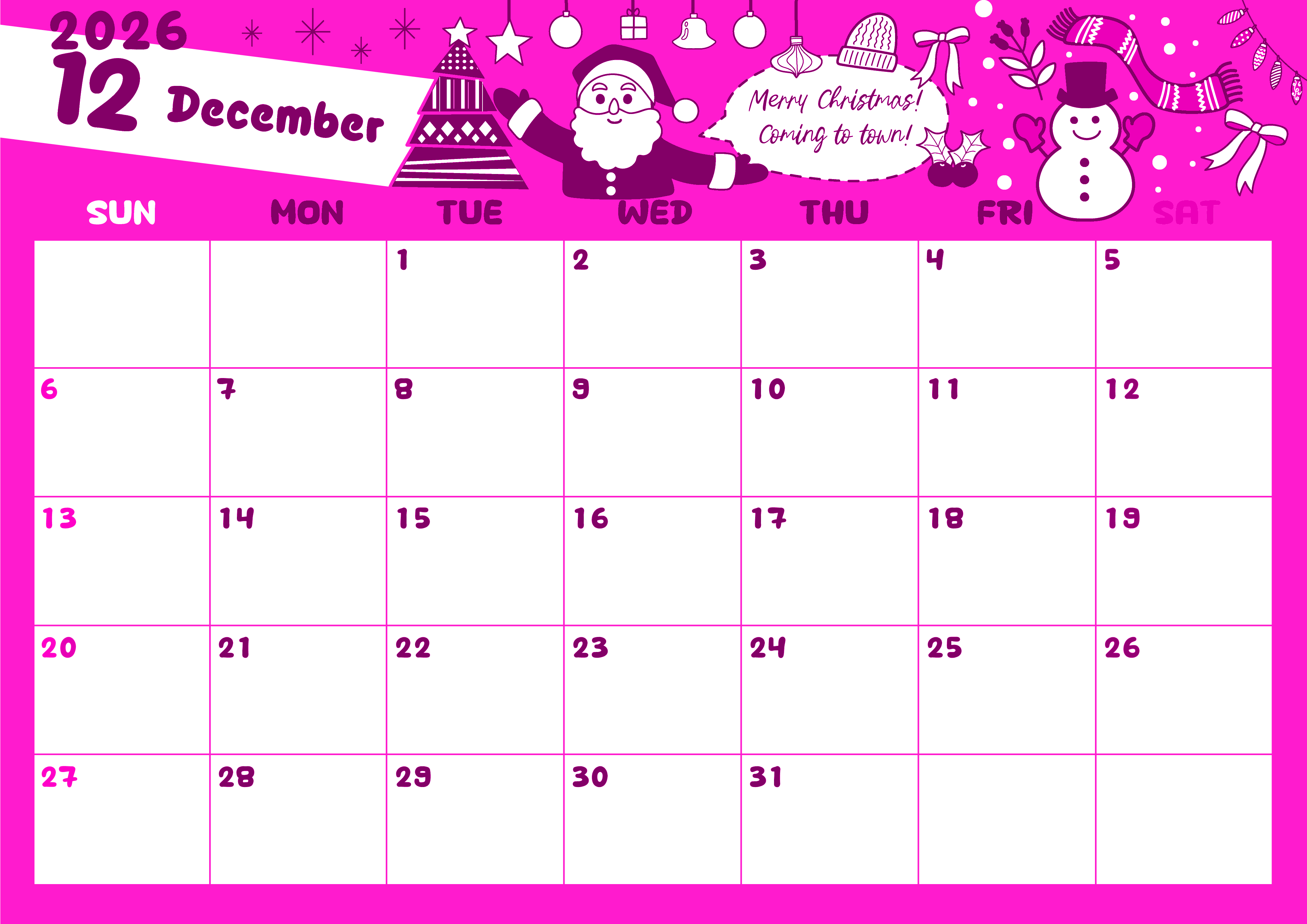 2026年12月横型日曜始まりの無料テンプレートピンクのカレンダーです。サンタやマフラーや雪だるまやクリスマスツリーやオーナメントといったグッズが目白押しの賑やかな明るいかわいいイラストとなっています。(2026-00821200)