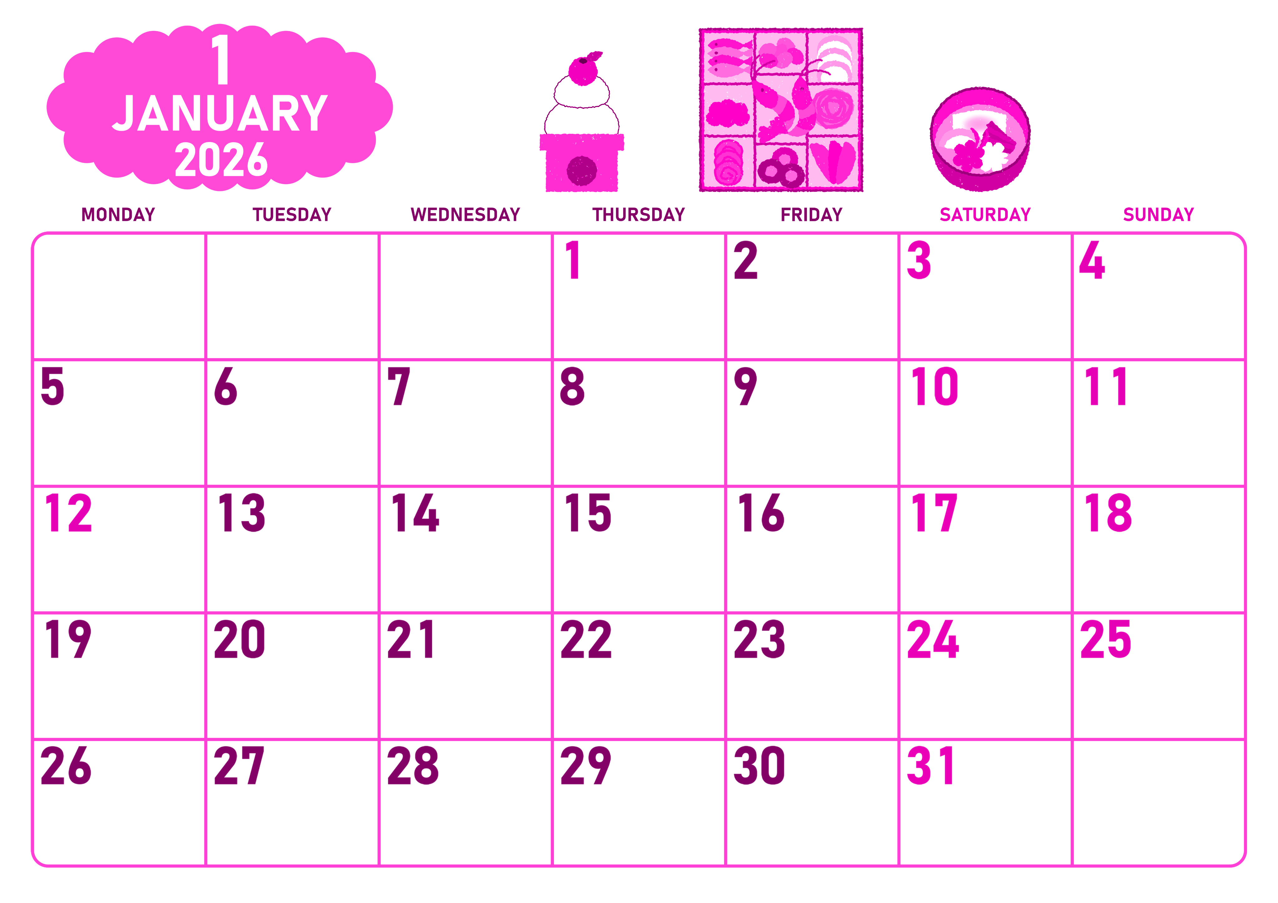 2026年1月横型月曜始まりピンクのカレンダーです。1月January2026年が目立つようにもくもくの中に白抜き印字されています。お節や鏡餅やお雑煮と食欲をそそるイラストがかわいいスケジュール管理に適したフリー素材です。(2026-00830101)