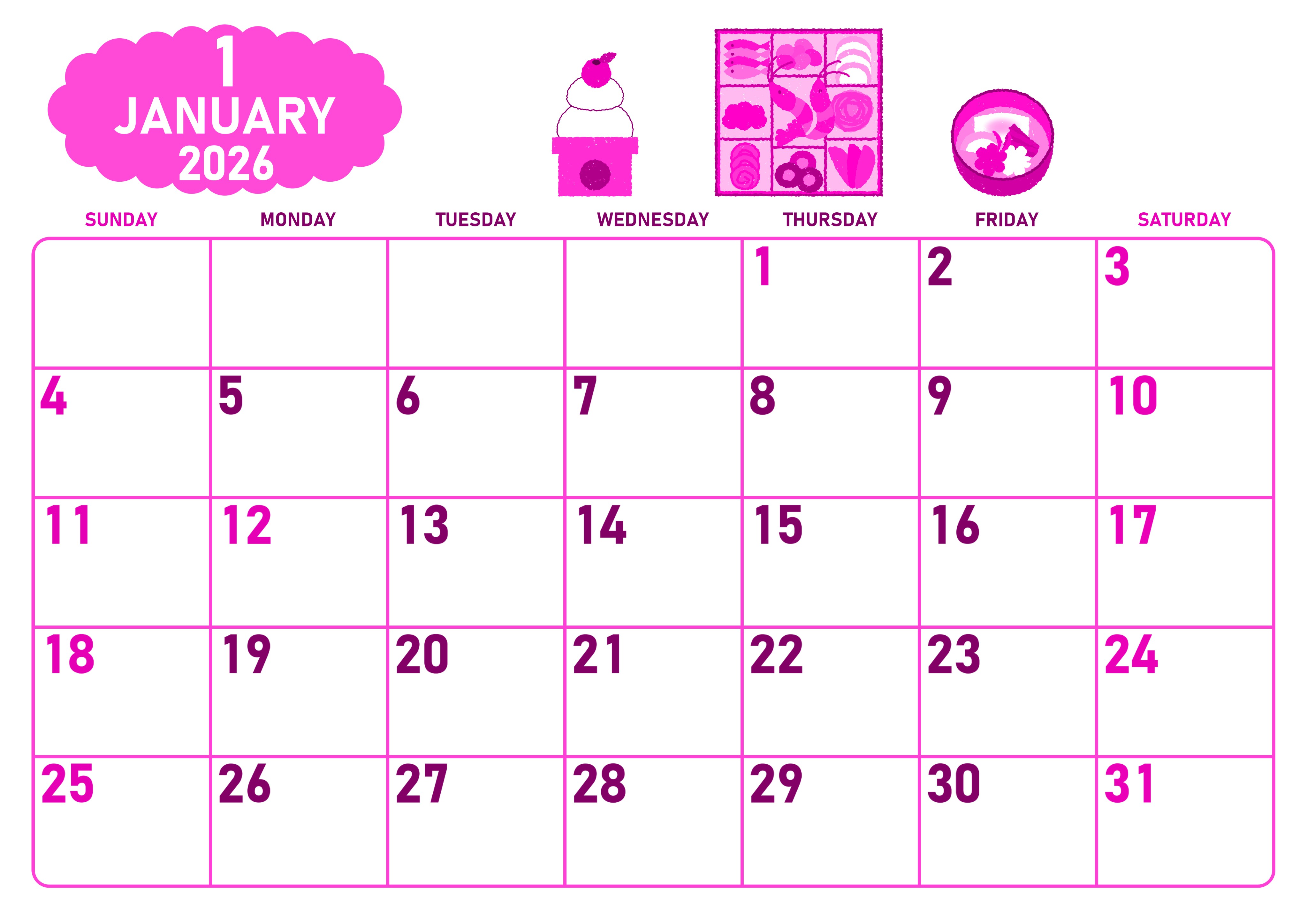 2026年1月横型日曜始まり お節イラストのかわいいA4無料ピンクのカレンダー(2026-00830100)