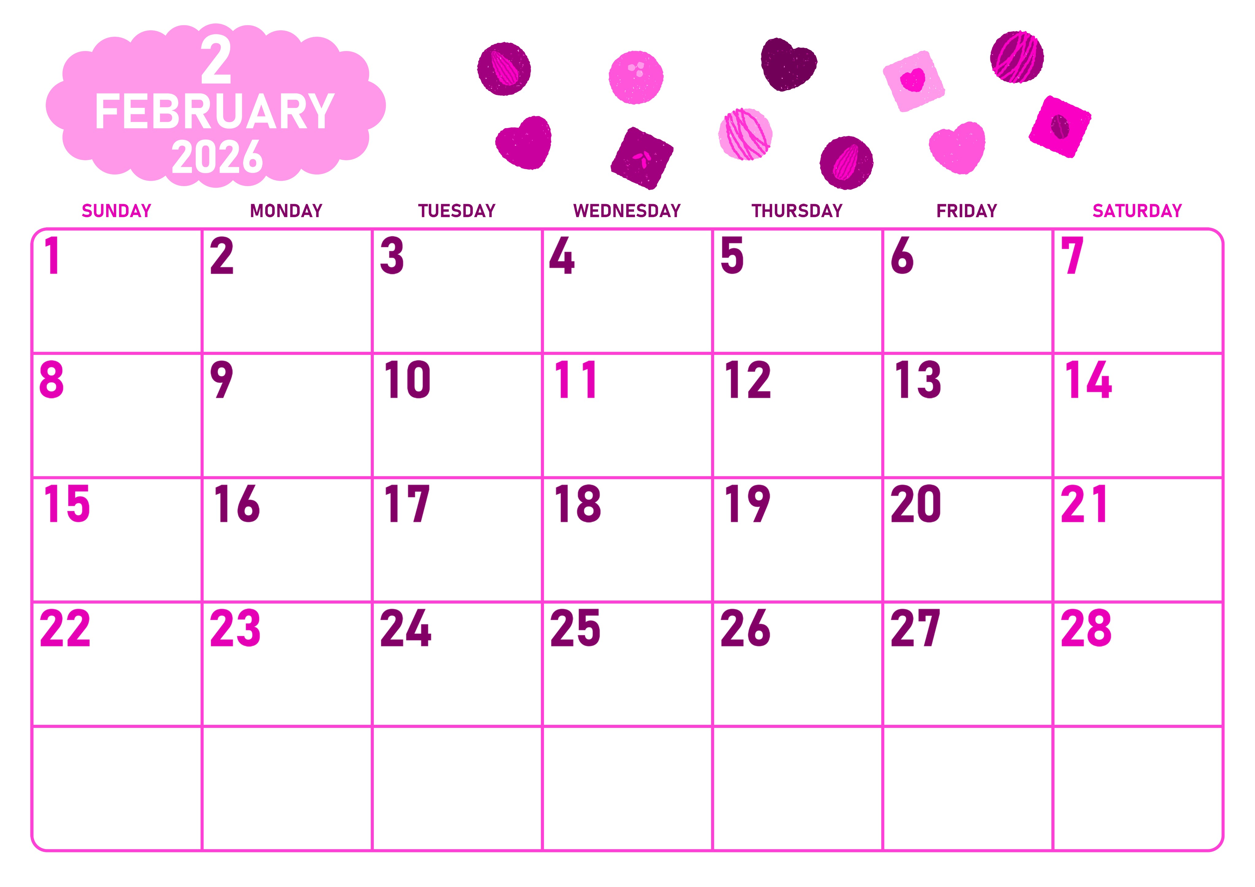 2026年2月横型日曜始まりピンクのカレンダーです。さまざまな形のチョコレートがウキウキ気分にさせてくれるおいしそうでかわいいイラストがバレンタインを彷彿とさせるA4ピンクのカレンダーです。(2026-00830200)