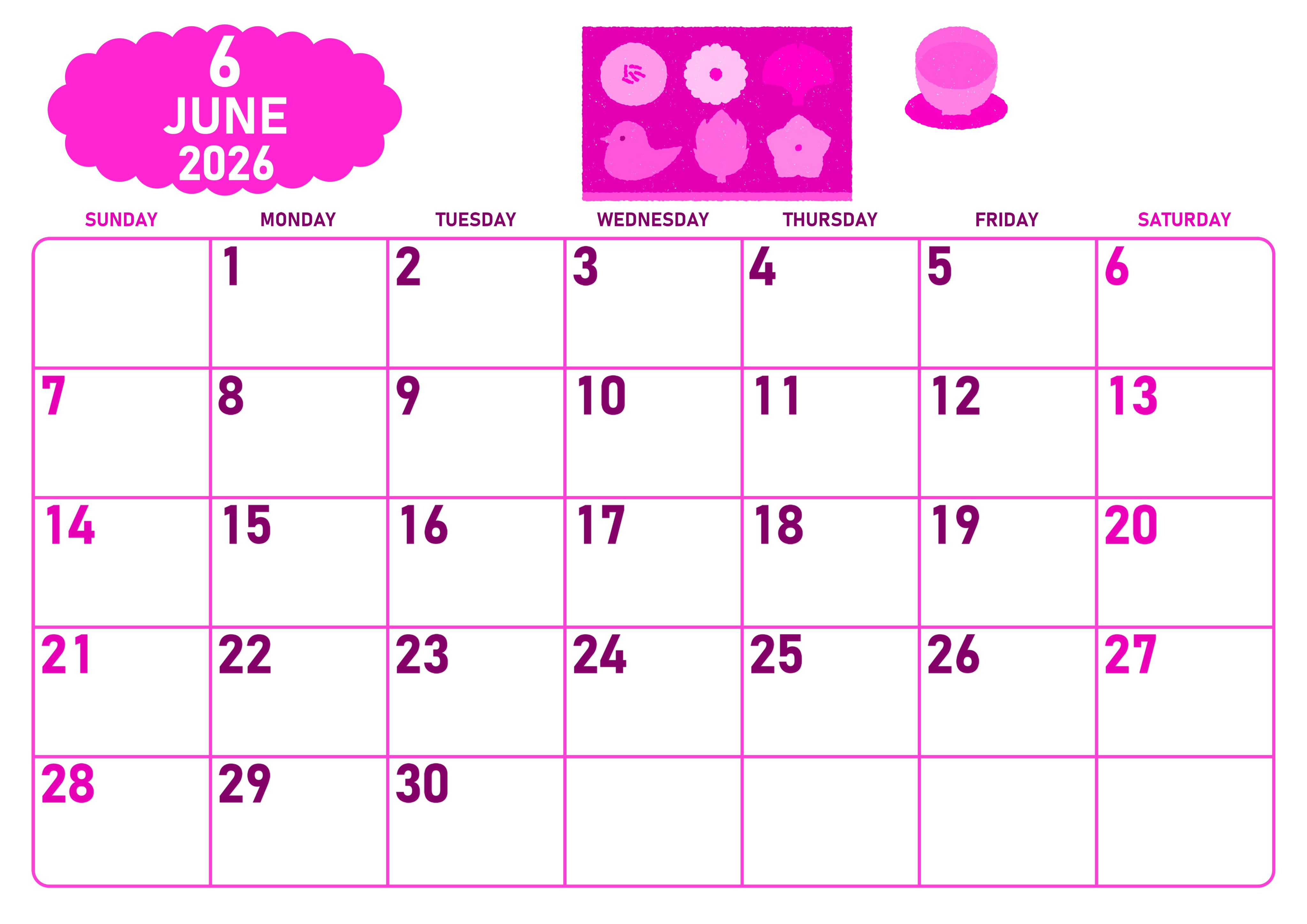 2026年6月横型日曜始まりの無料テンプレートピンクのカレンダーです。いろいろな種類の和菓子が詰まったボックスのイラストがワクワクさせてくれるようなかわいいイラストピンクのカレンダーは無料にてお使い頂けます。(2026-00830600)