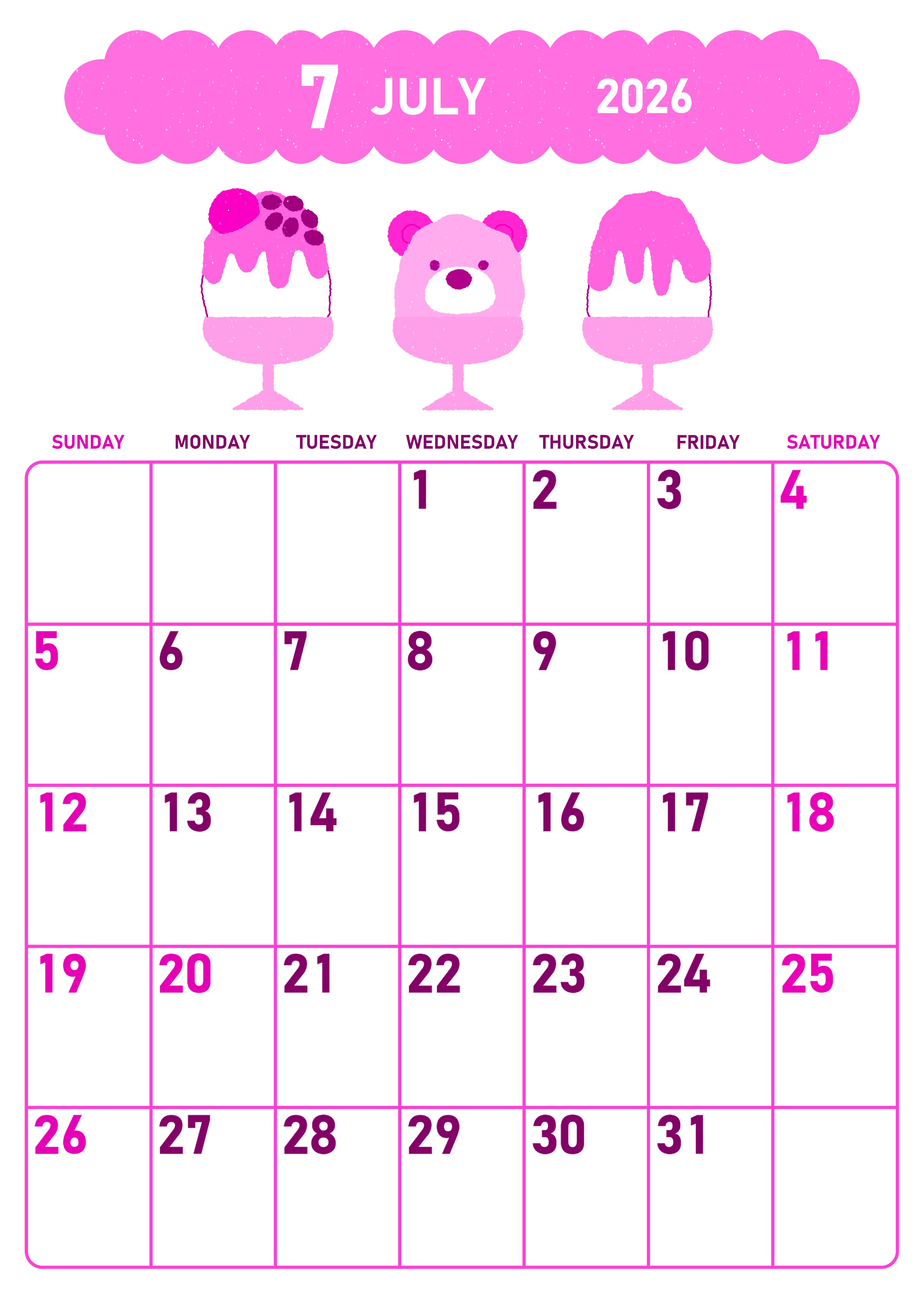 2026年7月縦型日曜始まりの無料テンプレートピンクのカレンダーです。かわいい飽きないようなデザインのイラスト付きピンクのカレンダーを探している人に向いているフリー素材です。かき氷が食べたくなるようなコンテンツです。(2026-00830710)