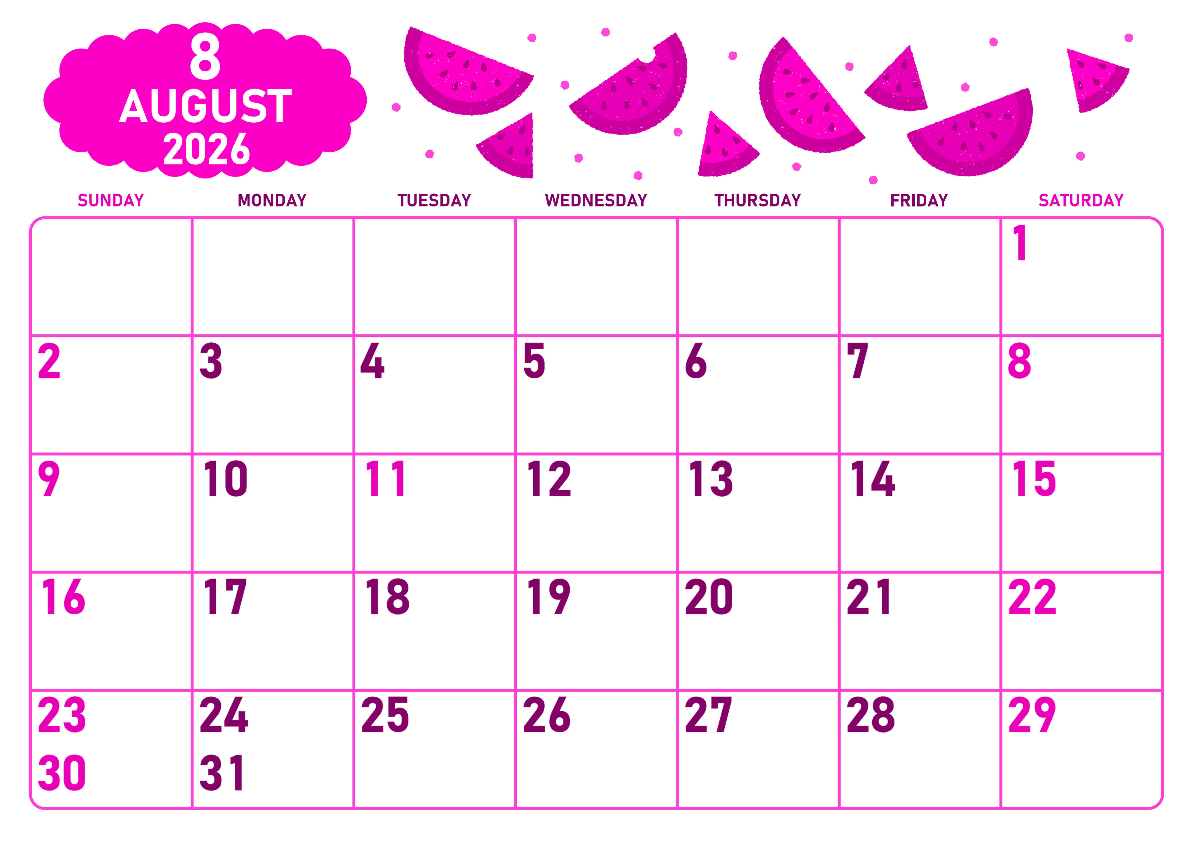 2026年・無料のカレンダーテンプレート 2026年8月横型日曜始まり 季節の果物イラストのかわいいA4無料ピンクのカレンダー(2026-00830800) 素材状デザイン王 2025年4月3日 2026年8月横型日曜始まりの無料テンプレートピンクのカレンダーです。季節の果物であるスイカを散りばめている遊び心が伝わってくるかわいいポップなデザインのイラストピンクのカレンダーを用意しました。(2026-00830800) 8月 横型のカレンダー 日曜始まり ピンク カレンダーデザイン-0083