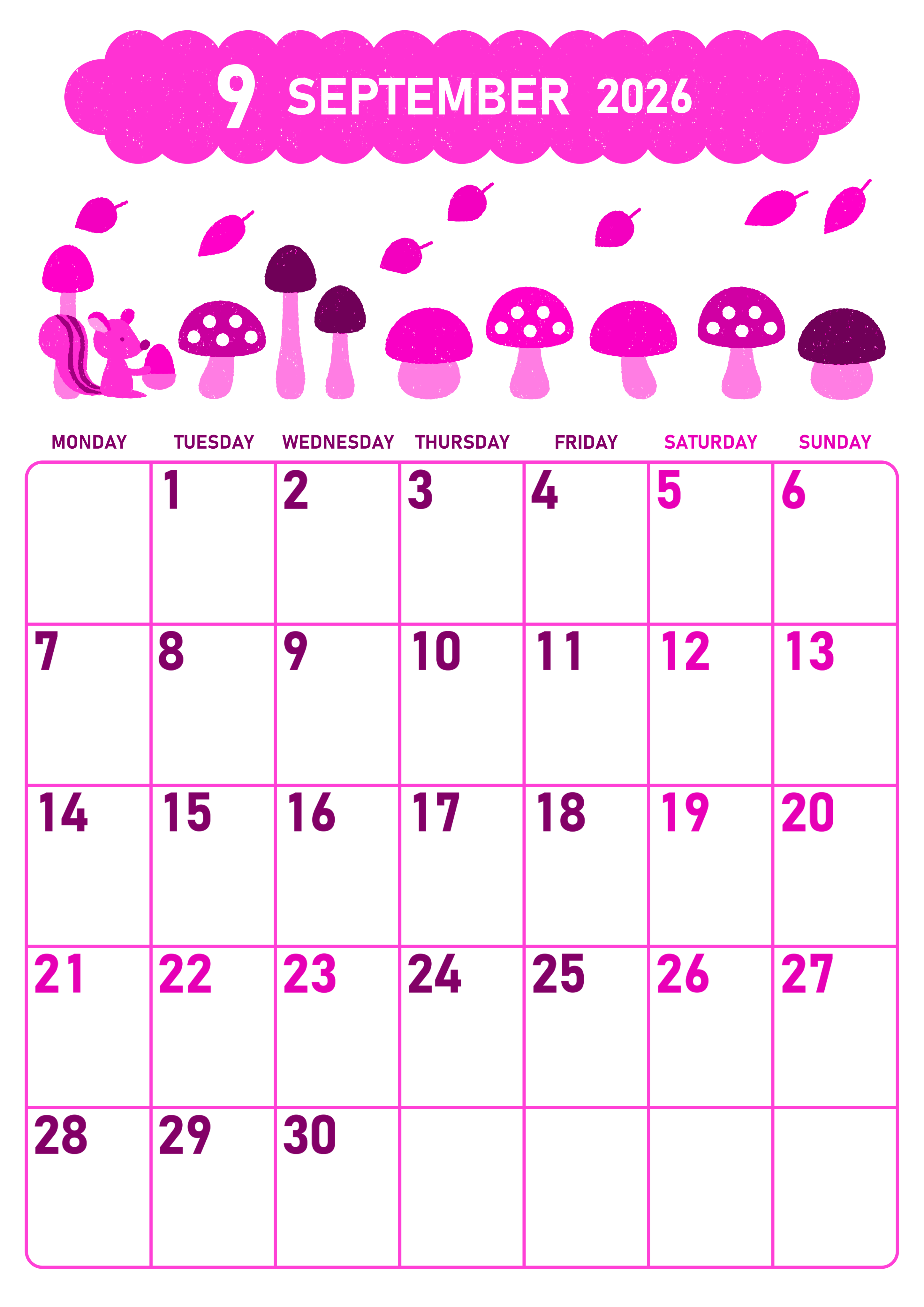 2026年9月縦型月曜始まりの無料テンプレートピンクのカレンダーです。秋の季節をテーマにしているイラストがほのぼのとしていてかわいいデザインです。月曜始まりで予定を把握しやすいレイアウトに仕上がっています。(2026-00830911)