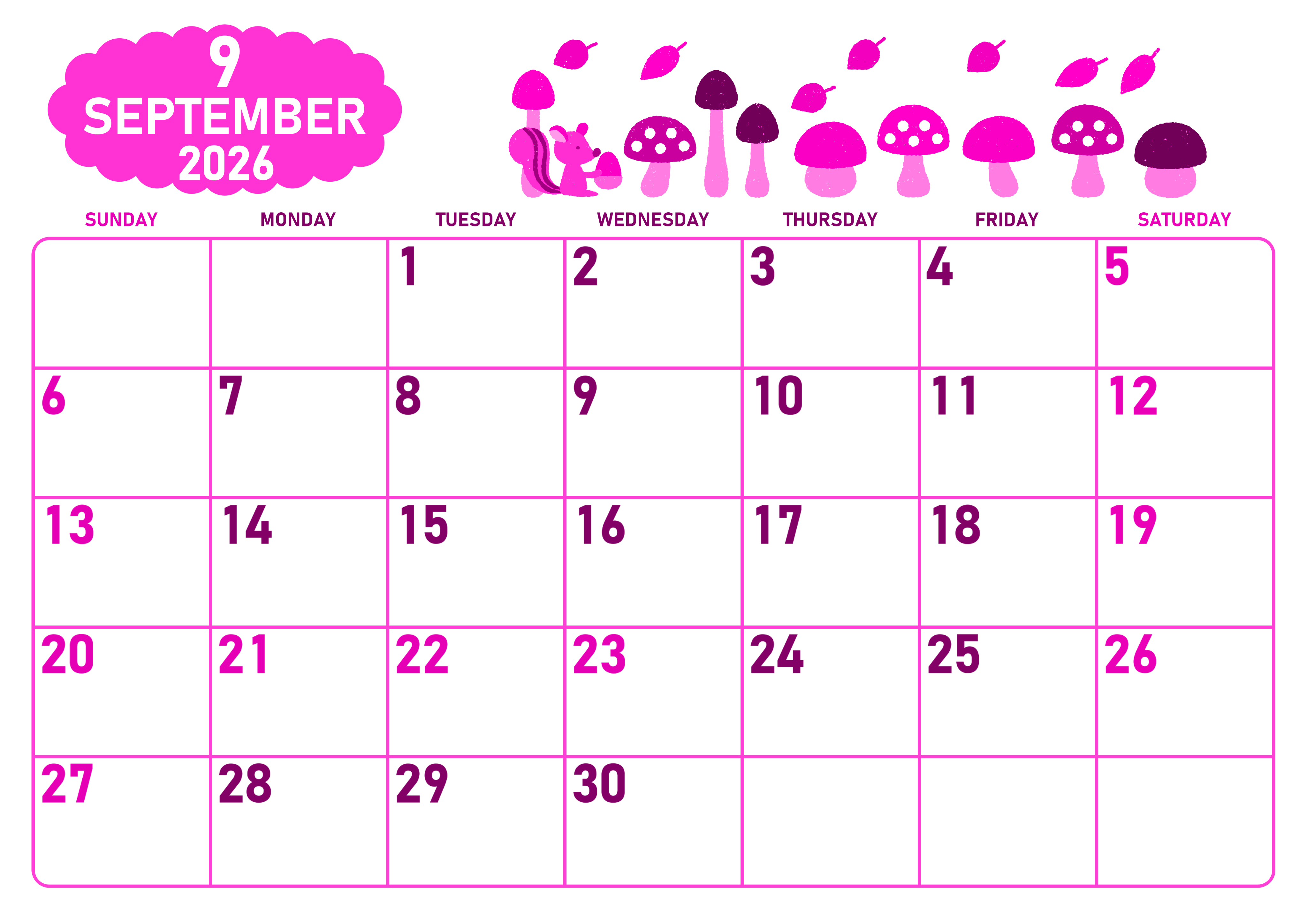 2026年9月横型日曜始まりの無料テンプレートピンクのカレンダーです。にょきにょきと生命力力強く天高く生えているたくさんのキノコが並んでいるイラストから秋の季節を感じさせられるかわいいイラストです。(2026-00830900)