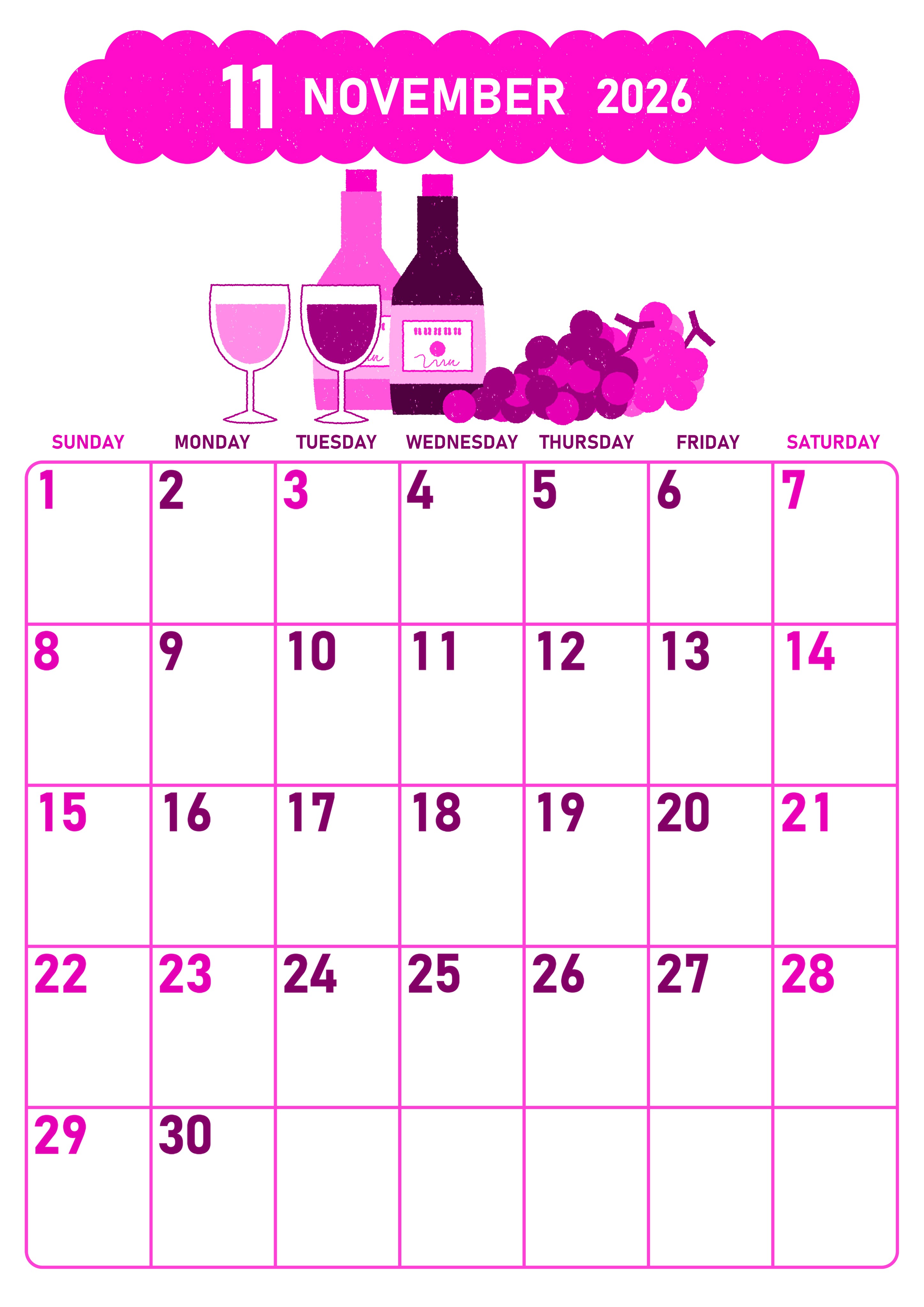 2026年・無料のカレンダーテンプレート 2026年11月縦型日曜始まり ぶどうイラストのかわいいA4無料ピンクのカレンダー(2026-00831110) 素材状デザイン王 2025年4月3日 2026年11月縦型日曜始まりの無料テンプレートピンクのカレンダーです。ぶどうも美しいかわいいイラストに仕上げました。縦向きなので壁に貼って利用するのに適しています。(2026-00831110) 11月 縦型のカレンダー 日曜始まり ピンク カレンダーデザイン-0083