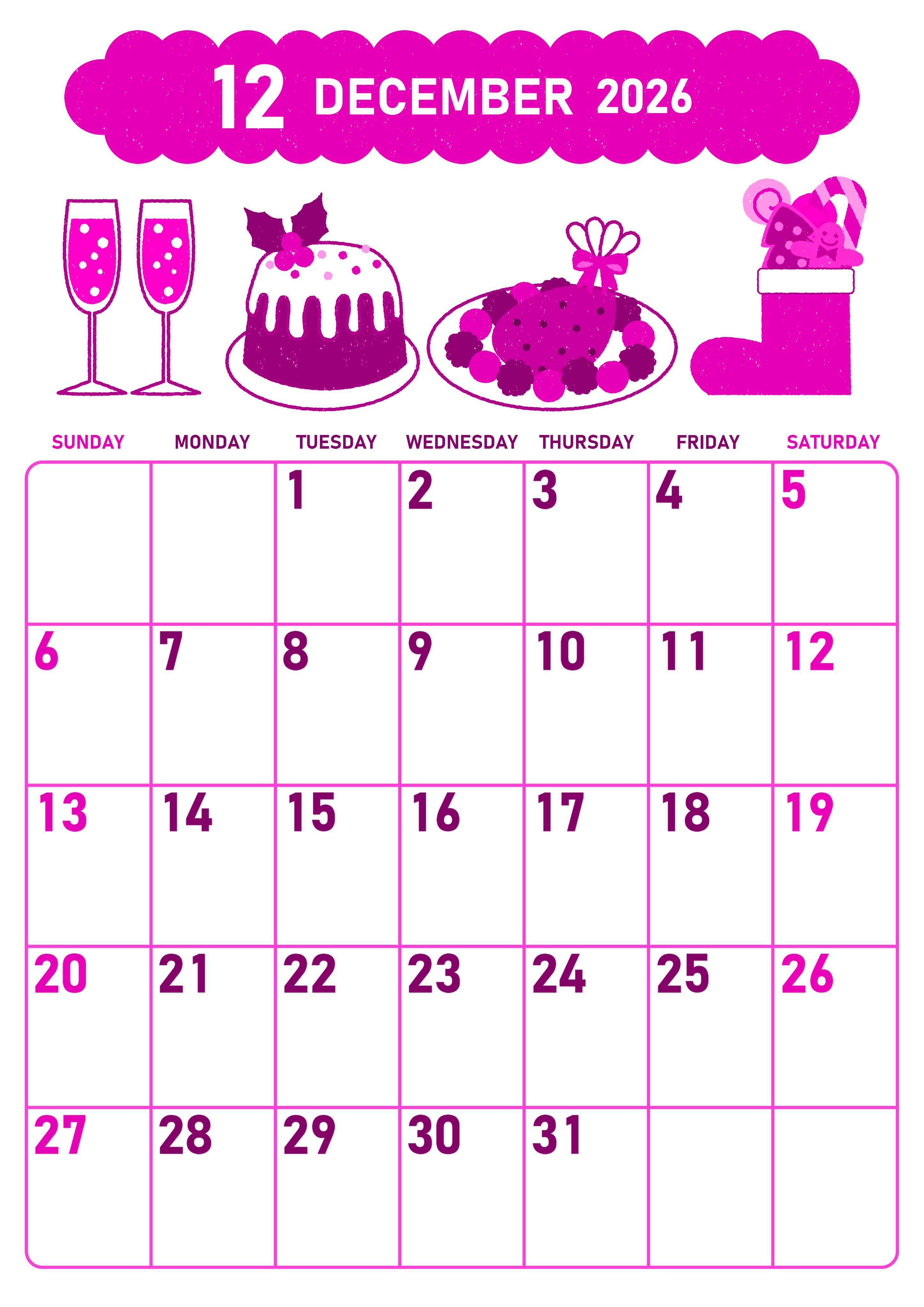 2026年・無料のカレンダーテンプレート 2026年12月縦型日曜始まり 御馳走イラストのかわいいA4無料ピンクのカレンダー(2026-00831210) 素材状デザイン王 2025年4月3日 2026年12月縦型日曜始まりの無料テンプレートピンクのカレンダーです。七面鳥やケーキといった御馳走をかわいいテイストで描いたイラストです。罫線もしっかり引かれていて余白もたっぷりなので便利です。(2026-00831210) 12月 縦型のカレンダー 日曜始まり ピンク カレンダーデザイン-0083