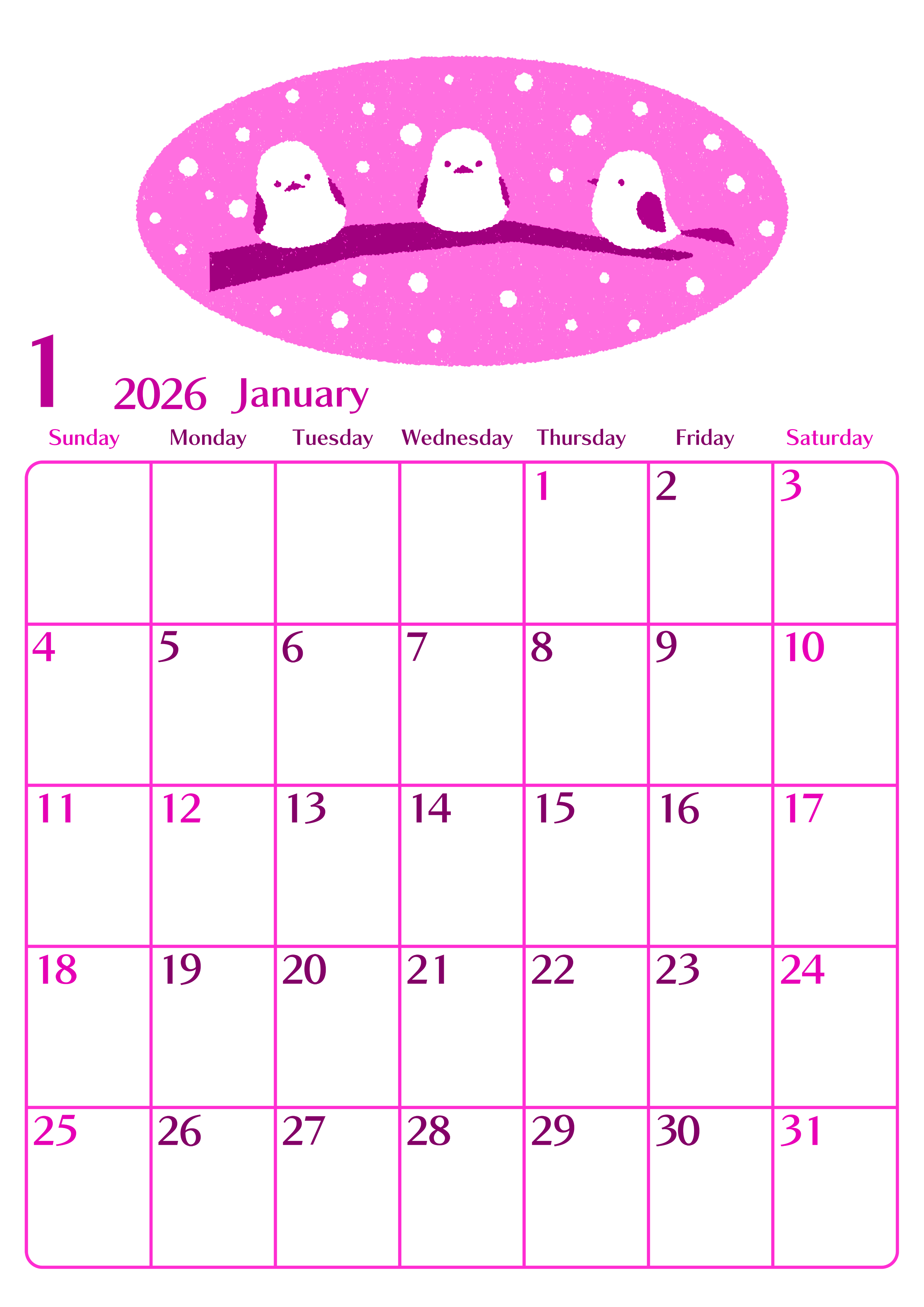2026年・無料のカレンダーテンプレート 2026年1月縦型日曜始まり イラストのおしゃれA4無料ピンクのカレンダー(2026-00840110) 素材状デザイン王 2025年4月3日 2026年1月縦型日曜始まりの無料テンプレートピンクのカレンダーです。おしゃれなので飽きることなく使い続けられるようなデザインとなっています。(2026-00840110) 1月 縦型のカレンダー 日曜始まり ピンク カレンダーデザイン-0084