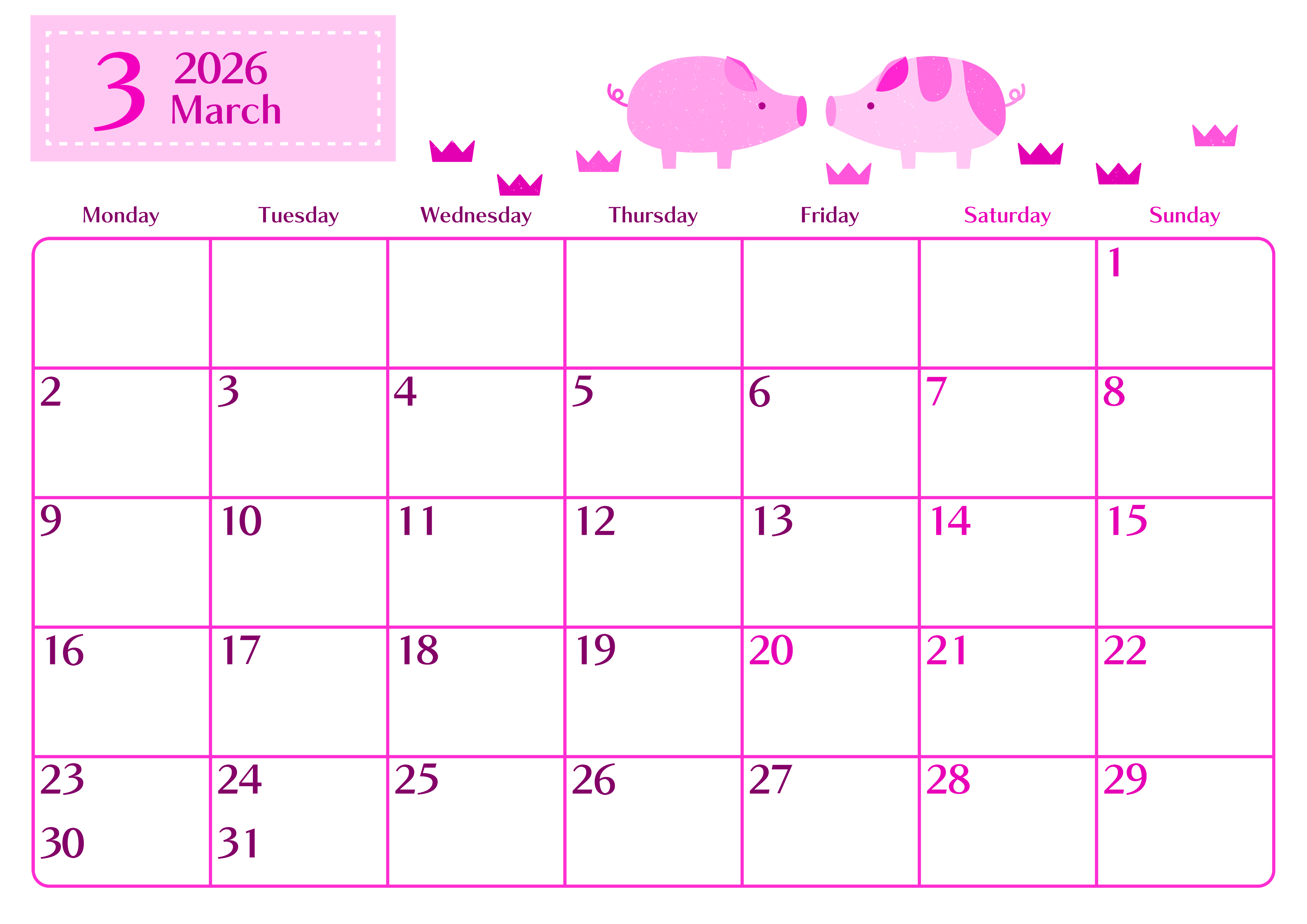 2026年3月横型月曜始まり 子豚イラストのおしゃれA4無料ピンクのカレンダー(2026-00840301)