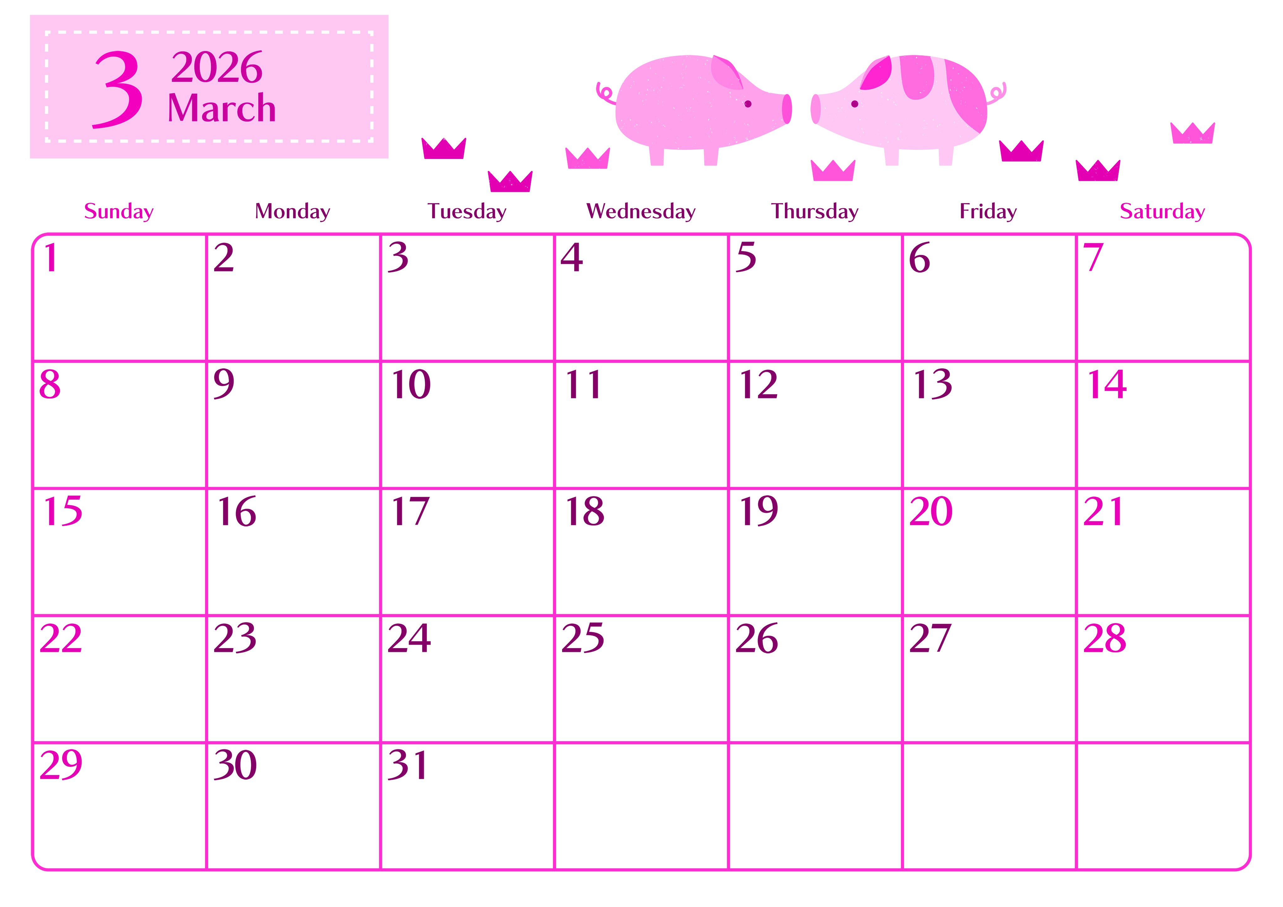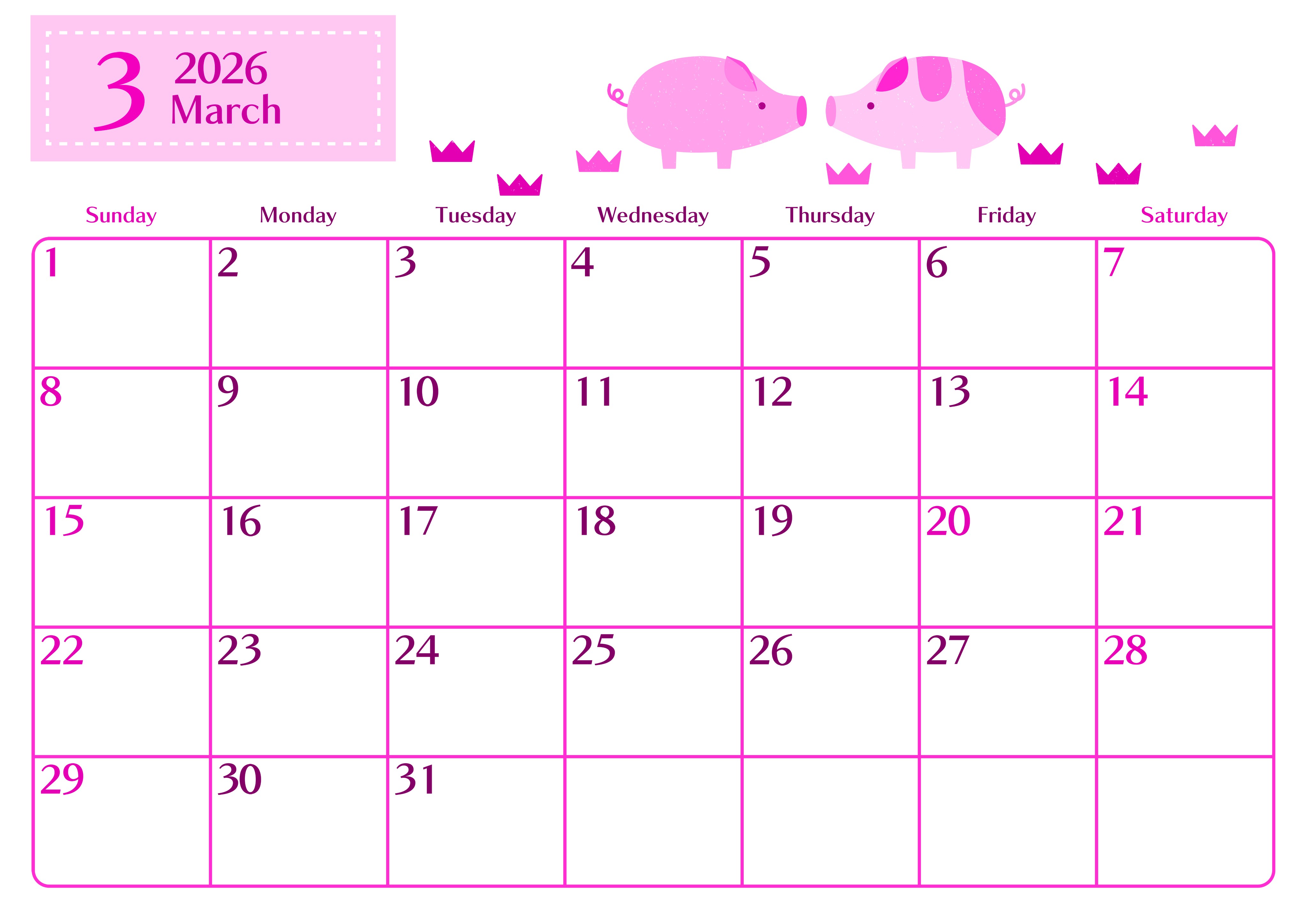 2026年3月横型日曜始まり 子豚イラストのおしゃれA4無料ピンクのカレンダー(2026-00840300)