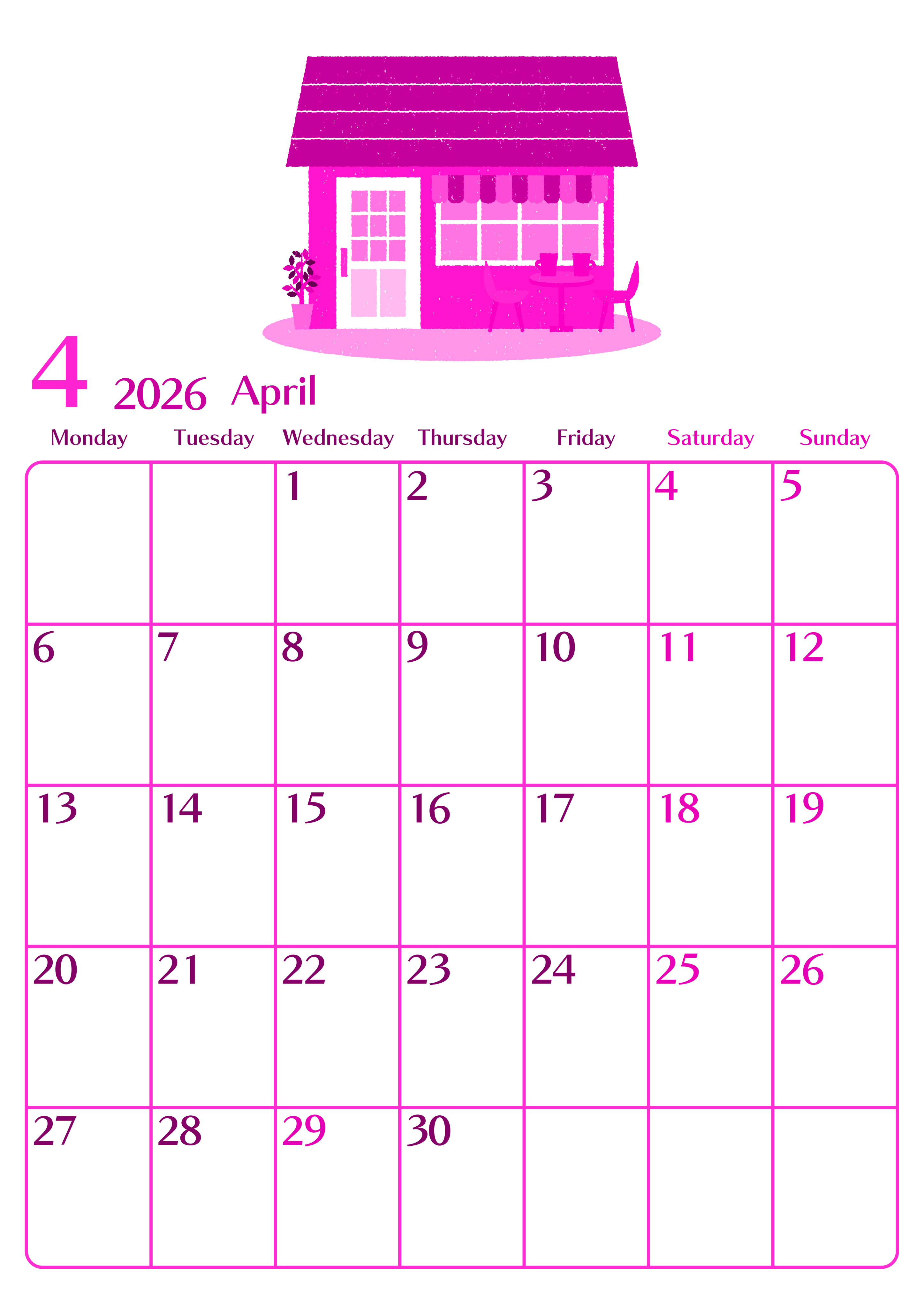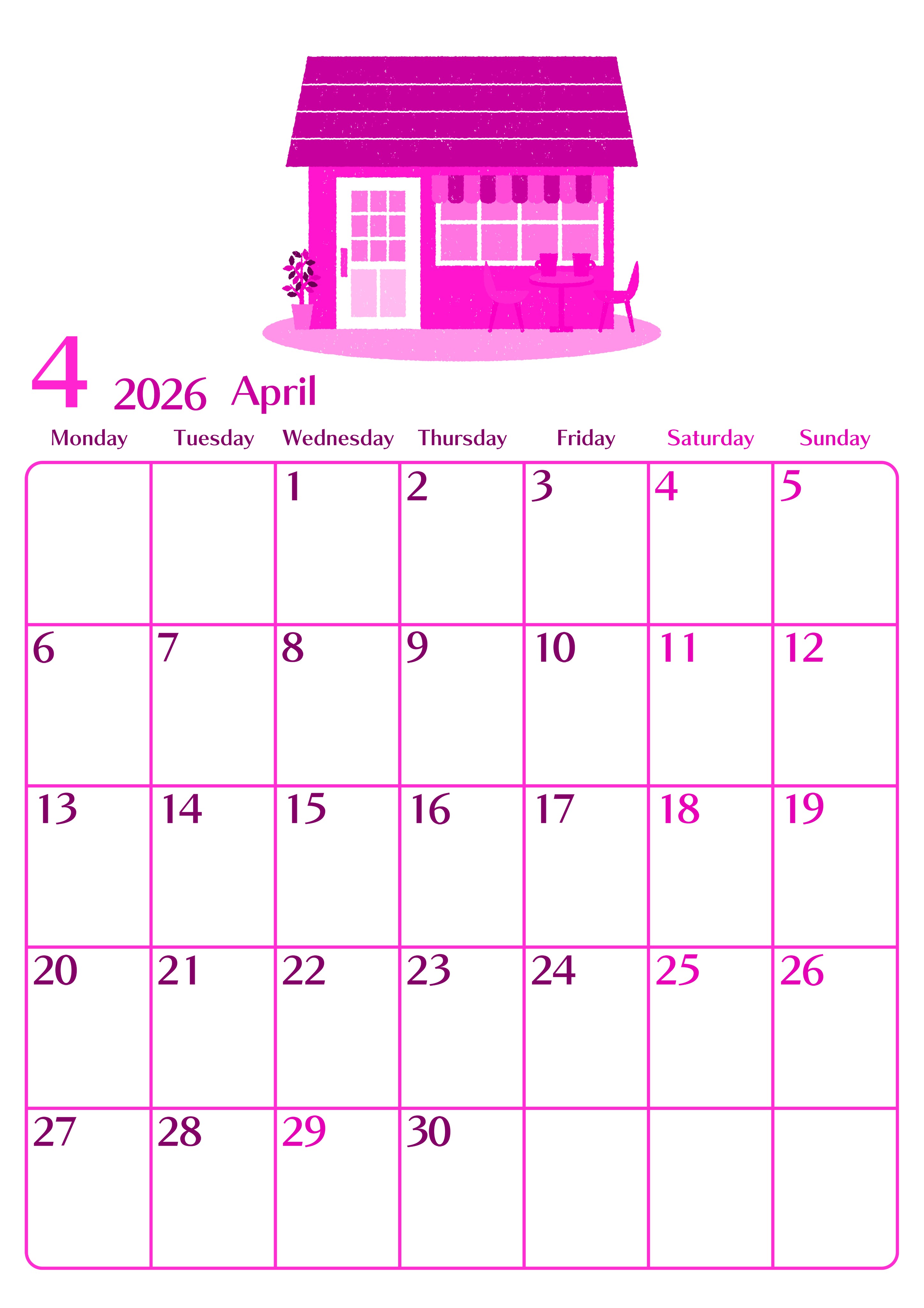 2026年4月縦型月曜始まりの無料テンプレートピンクのカレンダーです。縦型レイアウトのピンクのカレンダーなので壁に画鋲で貼ってスケジュールを見える化するために便利です。新生活を思わせるお家のイラストもシンプルでおしゃれなワンポイントです。(2026-00840411)