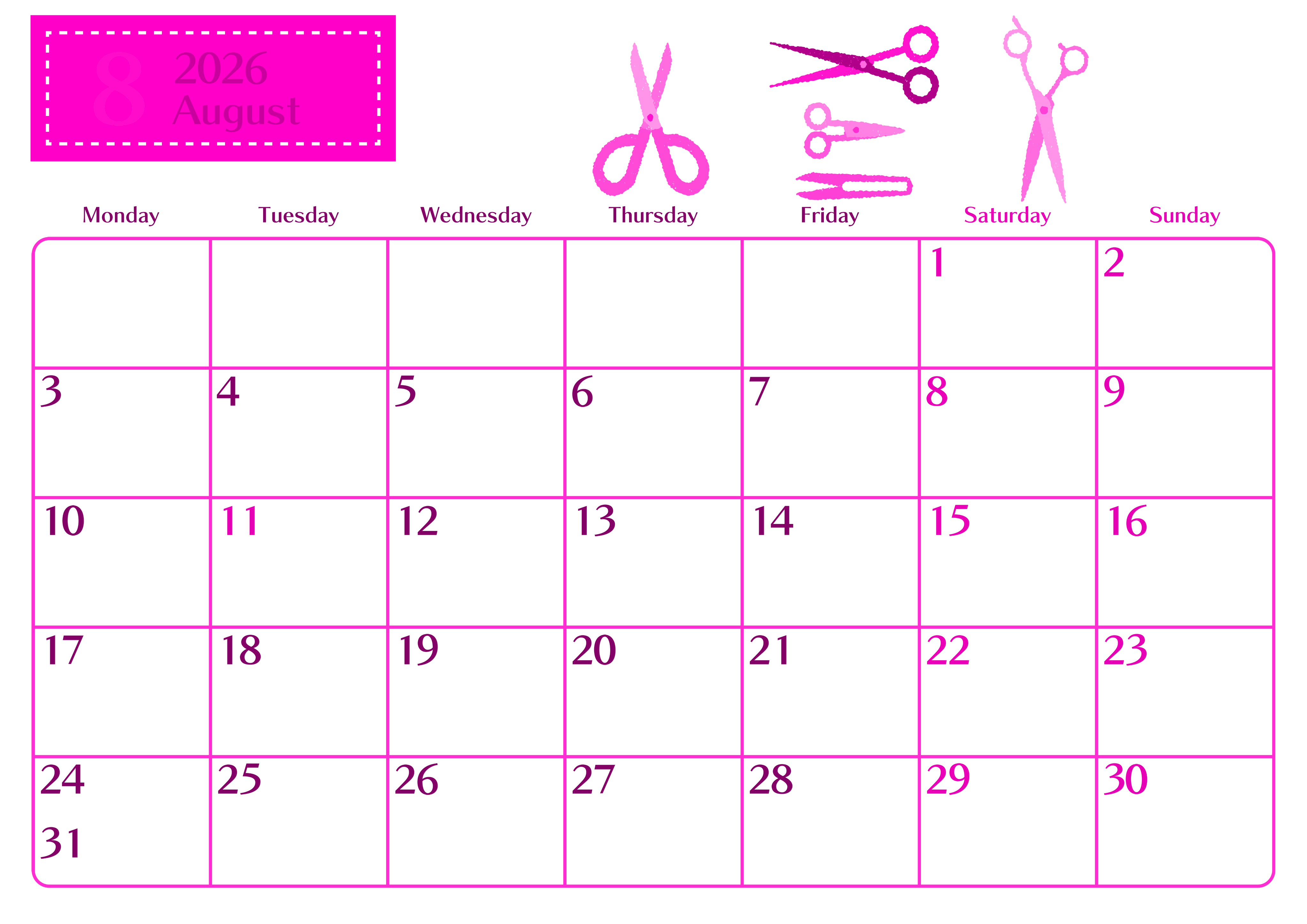 2026年8月横型月曜始まりの無料テンプレートピンクのカレンダーです。ステーショナリーのハサミをテーマにした落ち着いているおしゃれなデザインのイラストフリー素材です。余白もたっぷりなので夏休みを充実させるのに向いています。(2026-00840801)