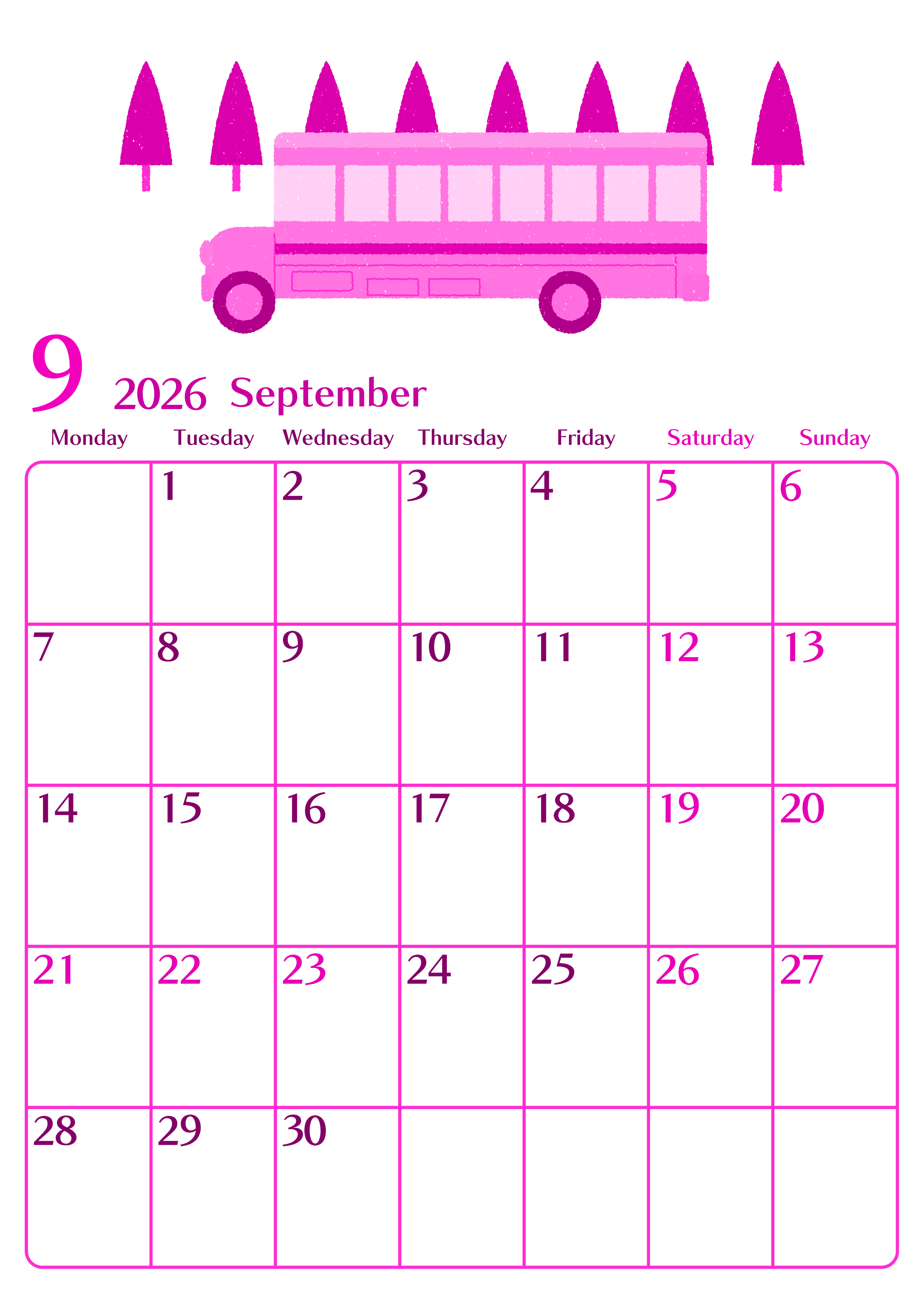 2026年9月縦型月曜始まりの無料テンプレートピンクのカレンダーです。新学期の勉強の予定を整理整頓して書き込むのにも向いているだけでなく、ピンクのカレンダー上部のバスのイラストがおとなっぽいおしゃれさを醸し出しています。(2026-00840911)