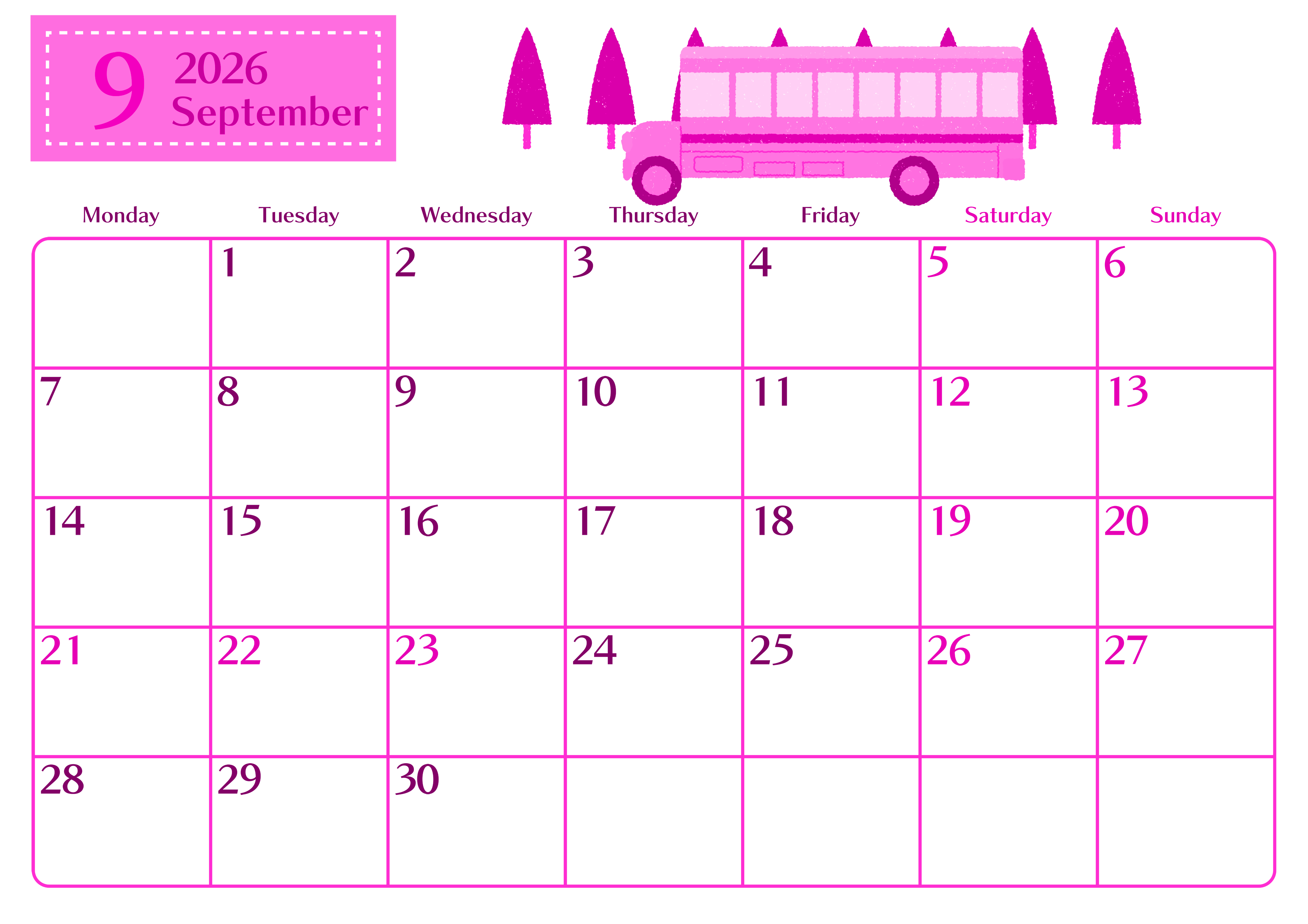 2026年9月横型月曜始まりの無料テンプレートピンクのカレンダーです。バスが街路樹を通りすぎるように走る様子のイラストがシンプルおしゃれで使うのが気持ち良くなるようなフリー素材となっていて月曜始まりなので便利です。(2026-00840901)