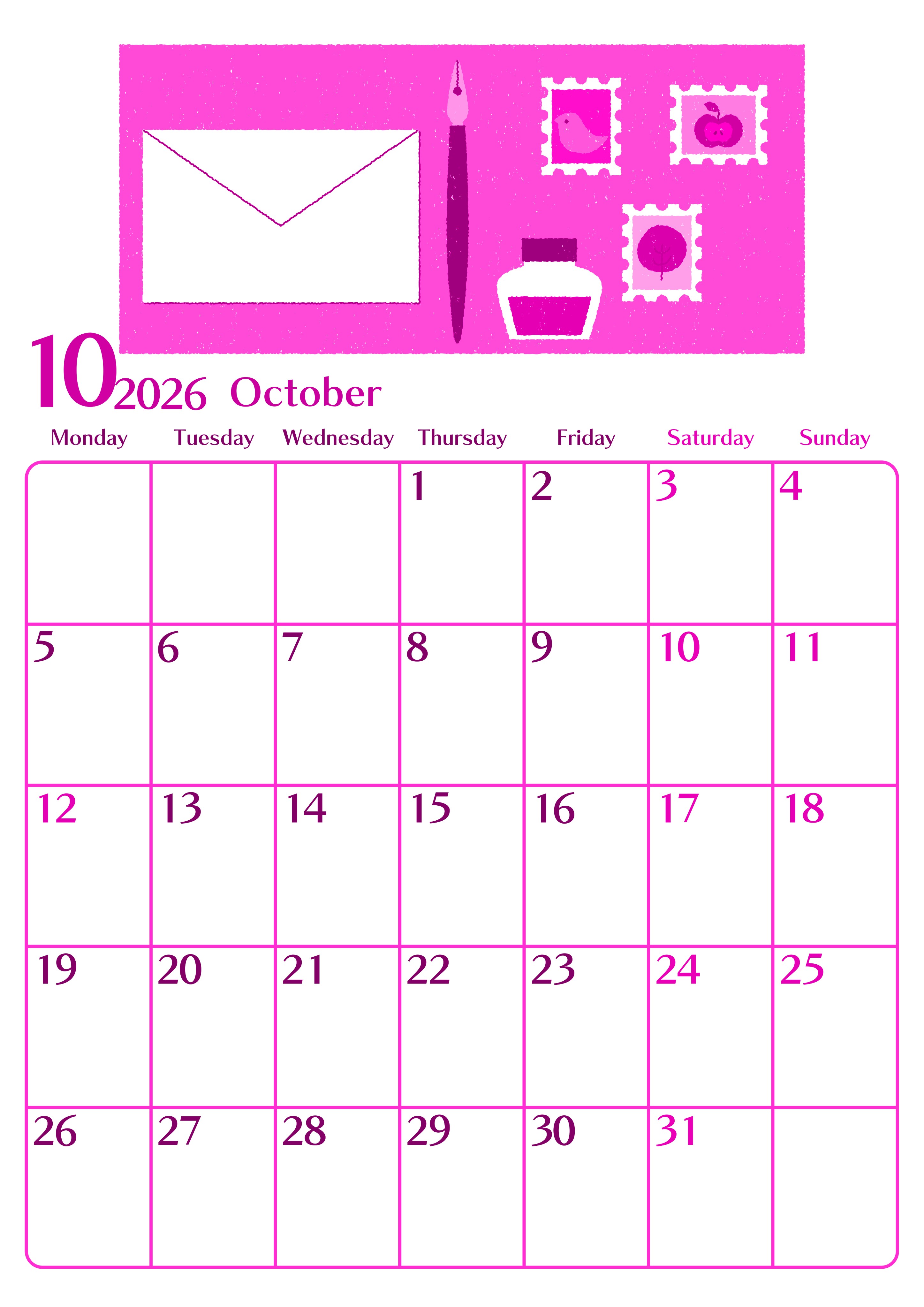 2026年10月縦型月曜始まりの無料テンプレートピンクのカレンダーです。手紙をはじめとするお手紙グッズをテーマにしたイラストがスタイリッシュでおしゃれな縦型ピンクのカレンダーとなっています。曜日ごとに文字の色が違うので見やすいです。(2026-00841011)