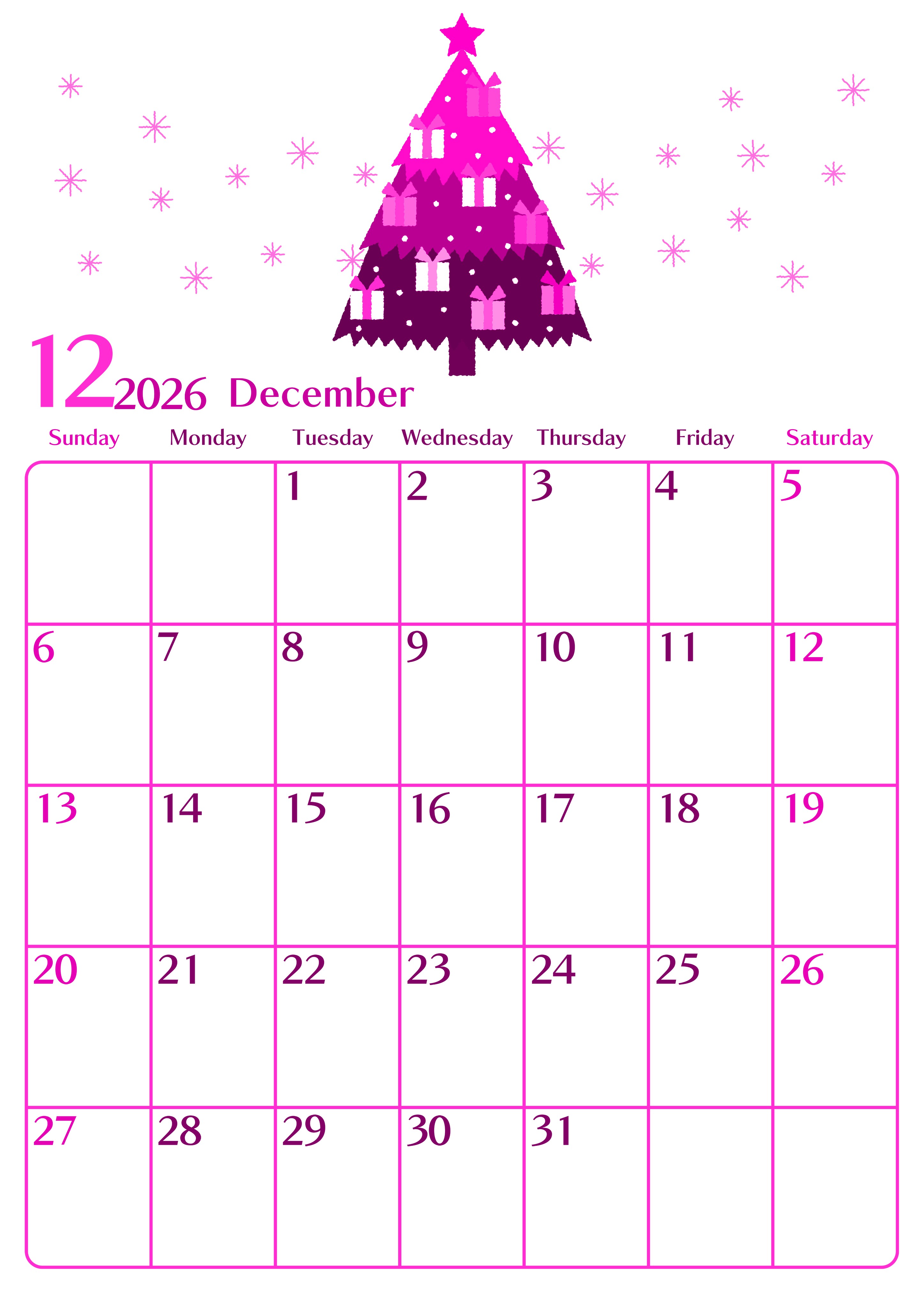 2026年12月縦型日曜始まりの無料テンプレートピンクのカレンダーです。クリスマスのワクワク感をテーマに取り上げたクリスマスツリーのイラストがおとなっぽくておしゃれな年末の予定を立てるのが楽しくなるピンクのカレンダーフリー素材です。(2026-00841210)