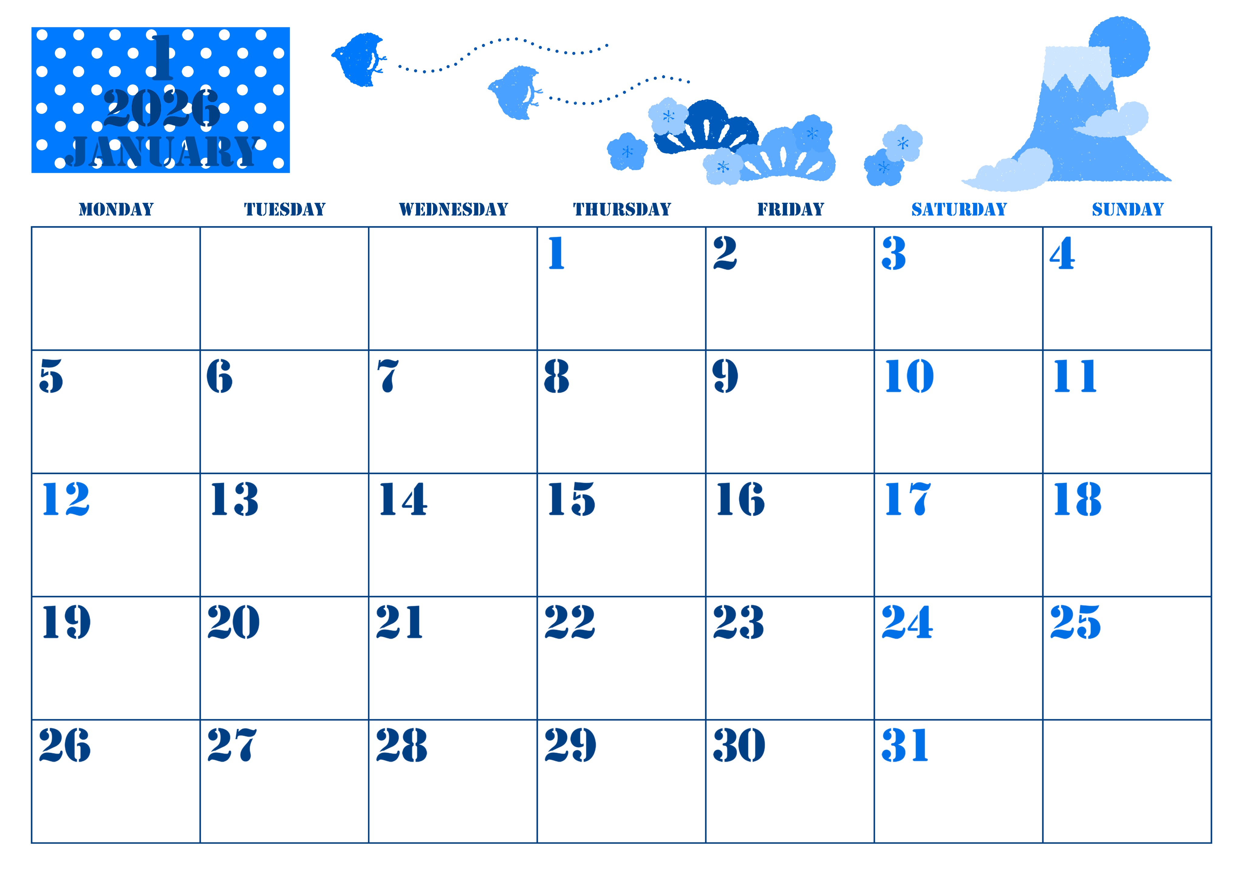 2026年1月横型月曜始まりブルーのカレンダーです。和風ともレトロともとれる色合いでデザインされたかわいいイラストが新年のおめでたい雰囲気を盛り上げてくれます。月曜始まりなのでお仕事のタスク管理をするのに特に向いている便利なブルーのカレンダーです。(2026-00850101)