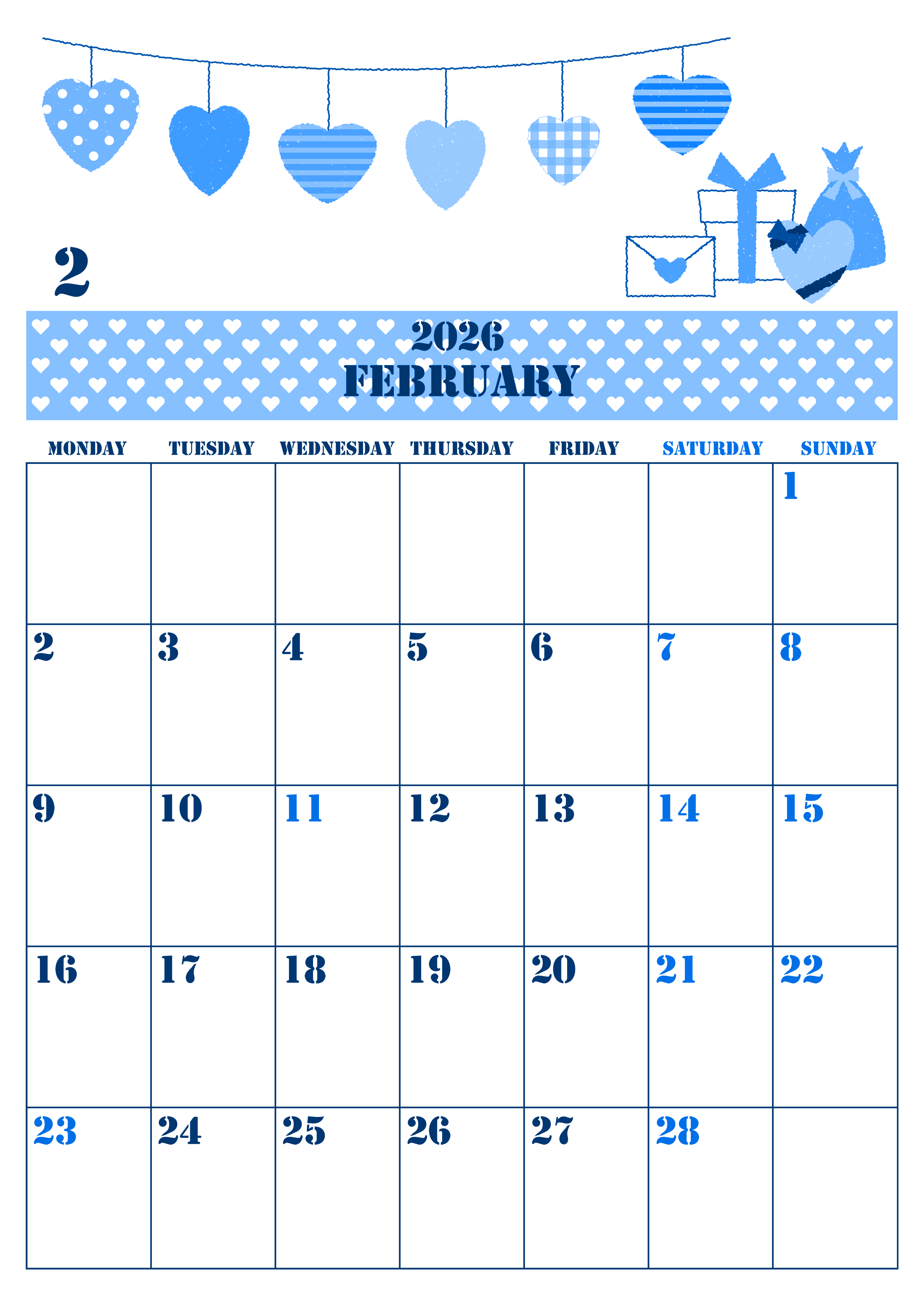 2026年2月縦型月曜始まりの無料テンプレートブルーのカレンダーです。月曜始まりなので家族の予定を立てるのにとても適しているフリー素材です。曜日によって文字の色分けがされているので読み違いを防げる縦型ブルーのカレンダーでイラストもかわいいです。(2026-00850211)