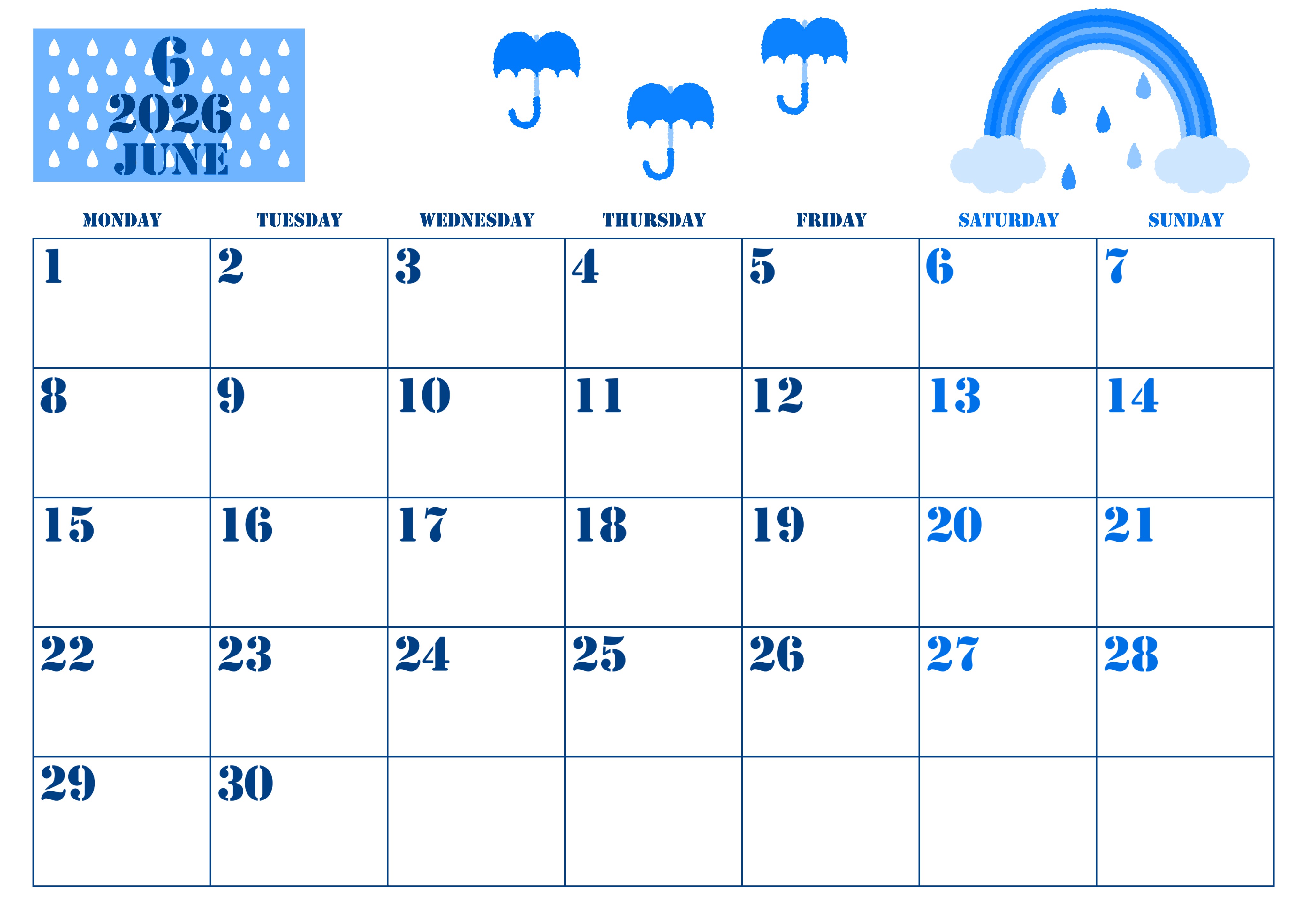 2026年・無料のカレンダーテンプレート 2026年6月横型月曜始まり 虹イラストのかわいいA4無料ブルーのカレンダー(2026-00850601) 素材状デザイン王 2025年4月4日 2026年6月横型月曜始まりの無料テンプレートブルーのカレンダーです。月曜始まりで仕事や勉強のタスク管理をしたいという人におすすめしたい虹のイラストがかわいいブルーのカレンダーの無料素材です。(2026-00850601) 6月 横型のカレンダー 月曜始まり ブルー カレンダーデザイン-0085