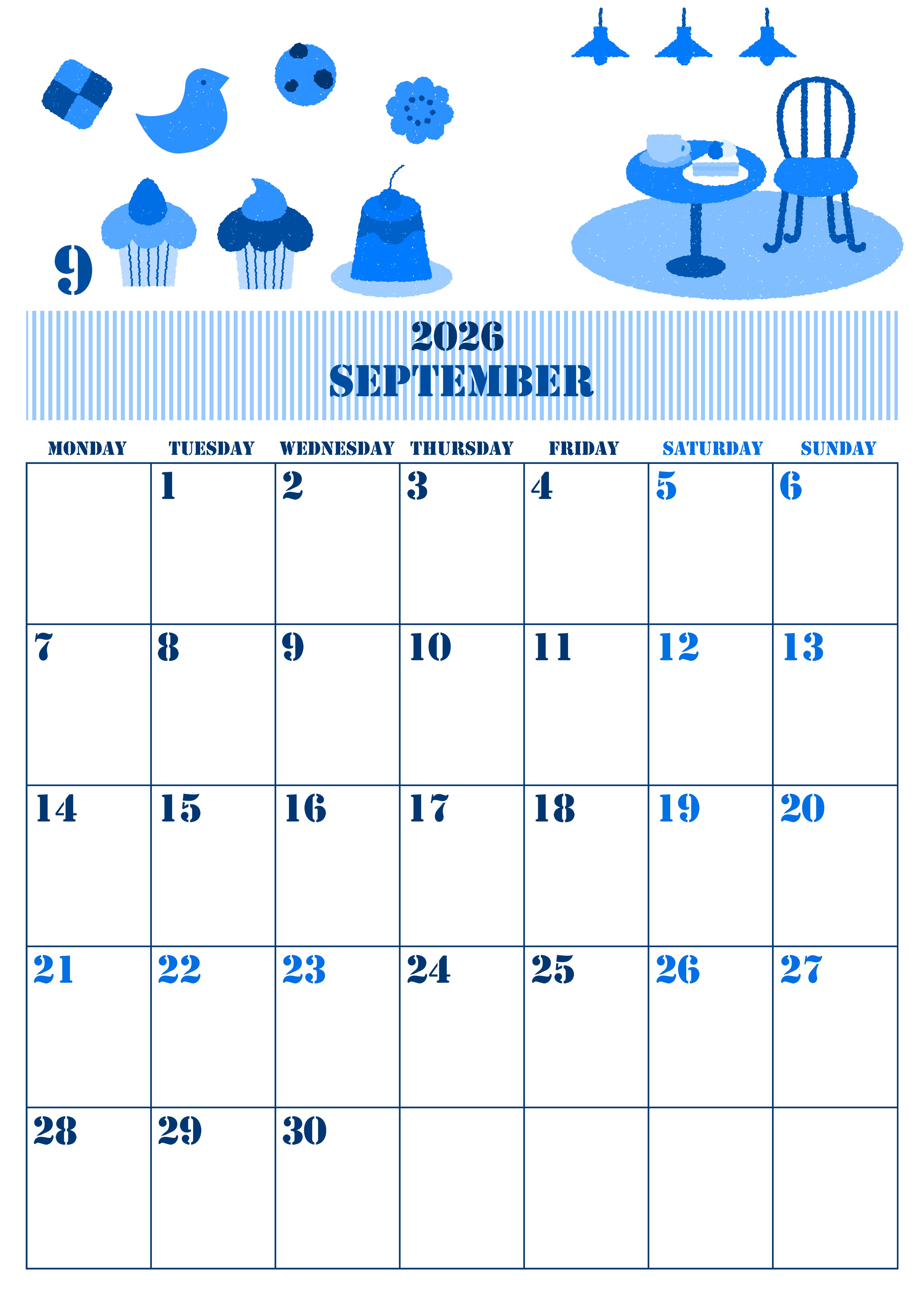 2026年9月縦型月曜始まりの無料テンプレートブルーのカレンダーです。食欲の秋に食べたくなるいろいろな種類のカップケーキのイラストがとてもかわいい女心をくすぐるような魅力的な月曜始まりブルーのカレンダーです。(2026-00850911)