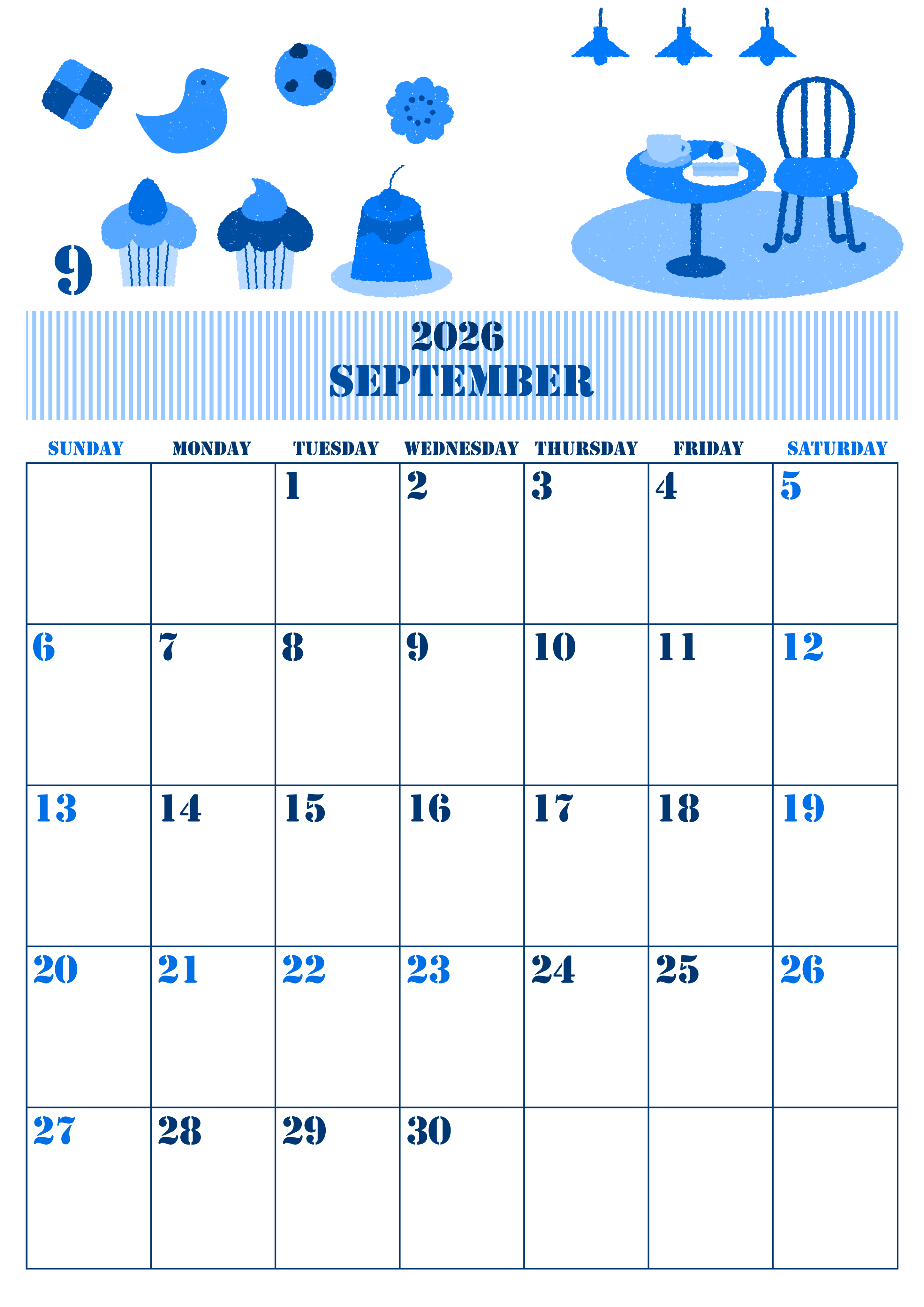 2026年9月縦型日曜始まりの無料テンプレートブルーのカレンダーです。食欲の秋をモチーフにしたかわいいカフェテイストなイラストブルーのカレンダーです。縦向きなので壁に貼って使うのにぴったりな無料で使えるコンテンツです。(2026-00850910)