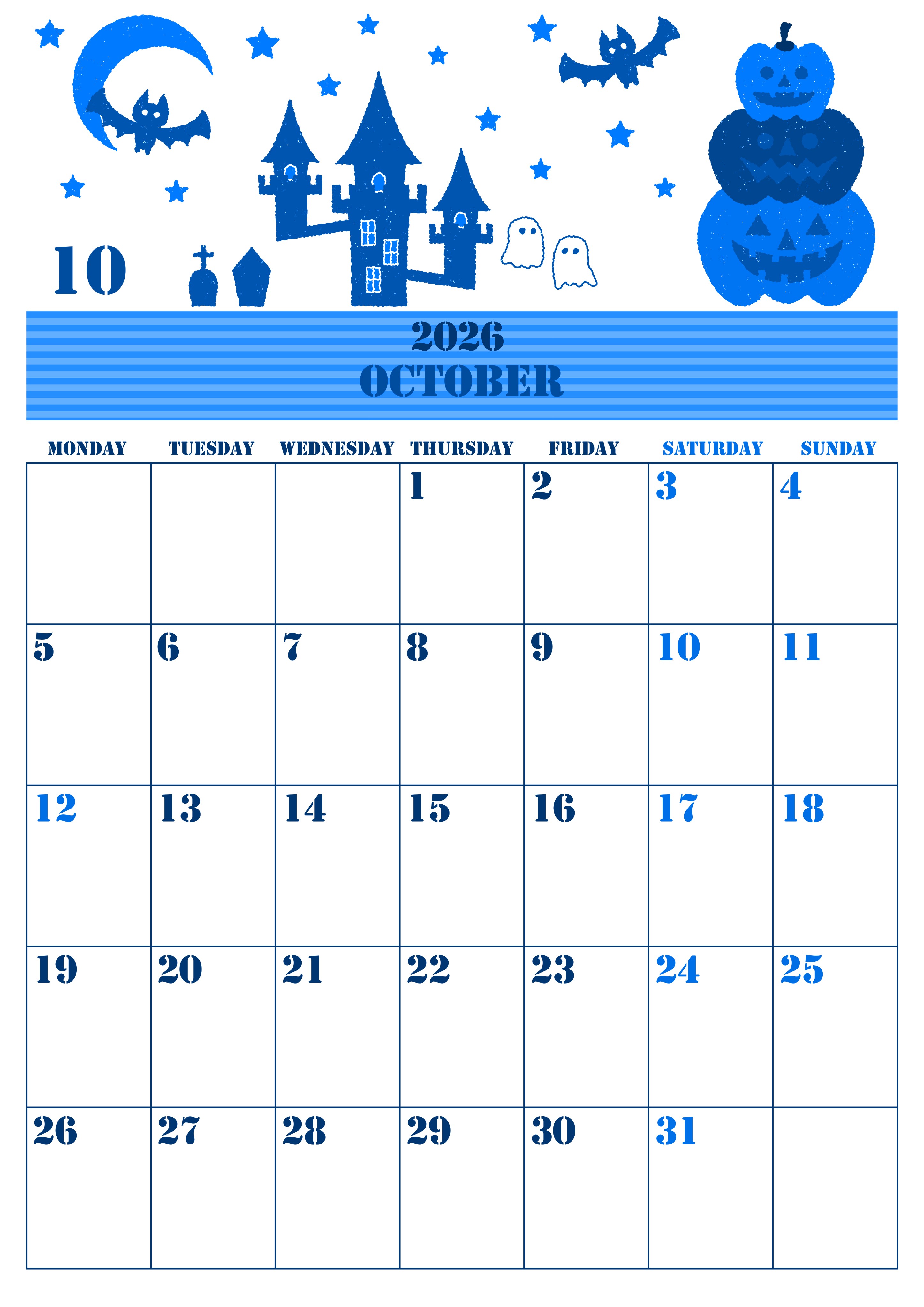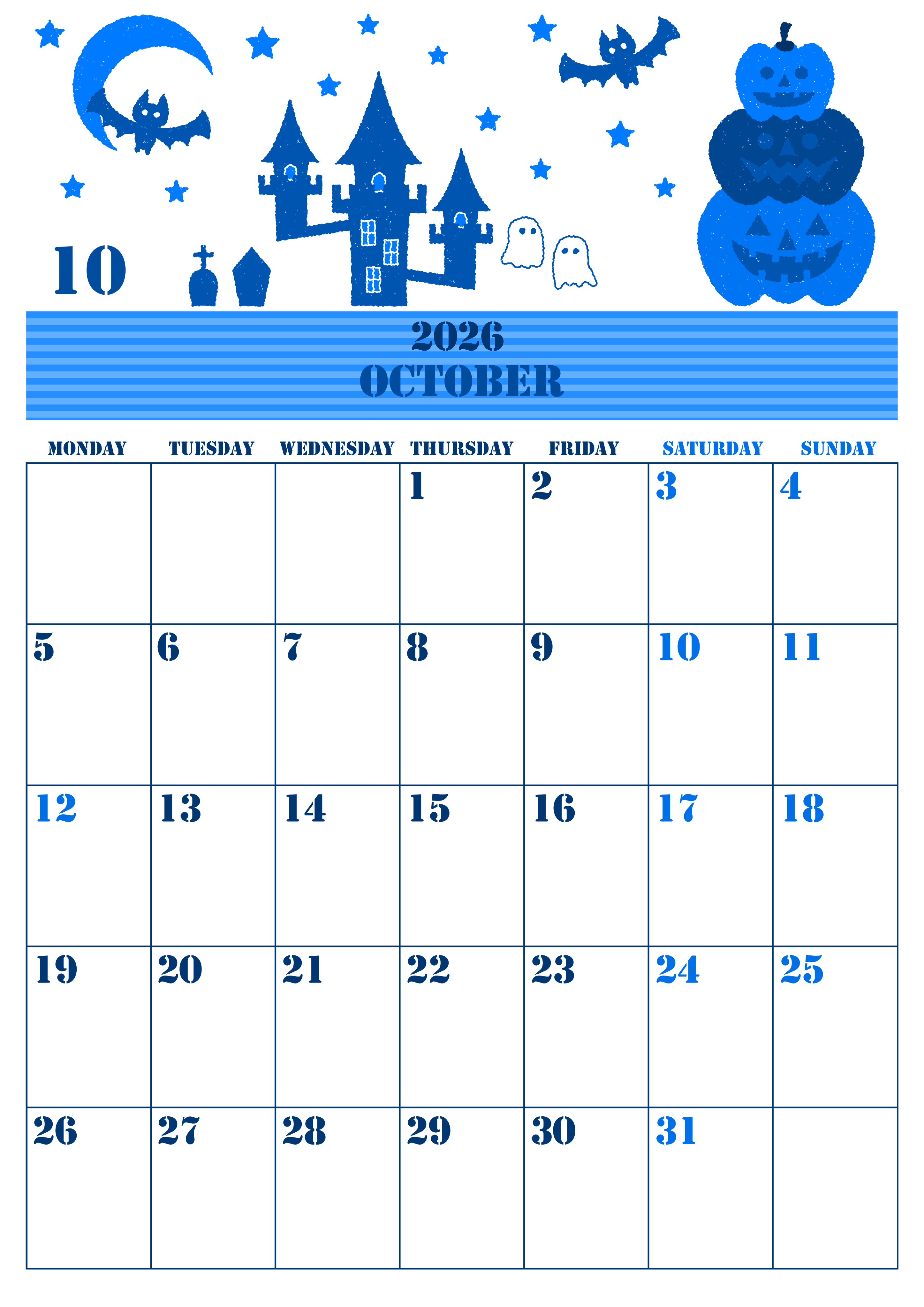 2026年・無料のカレンダーテンプレート 2026年10月縦型月曜始まり ハロウィンイラストがかわいいA4無料ブルーのカレンダー(2026-00851011) 素材状デザイン王 2025年4月4日 2026年10月縦型月曜始まりの無料テンプレートブルーのカレンダーです。月と星がちりばめている空を背景に白いおばけやコウモリがあちこちにいるハロウィンのイラストがポップでかわいいです。(2026-00851011) 10月 縦型のカレンダー 月曜始まり ブルー カレンダーデザイン-0085