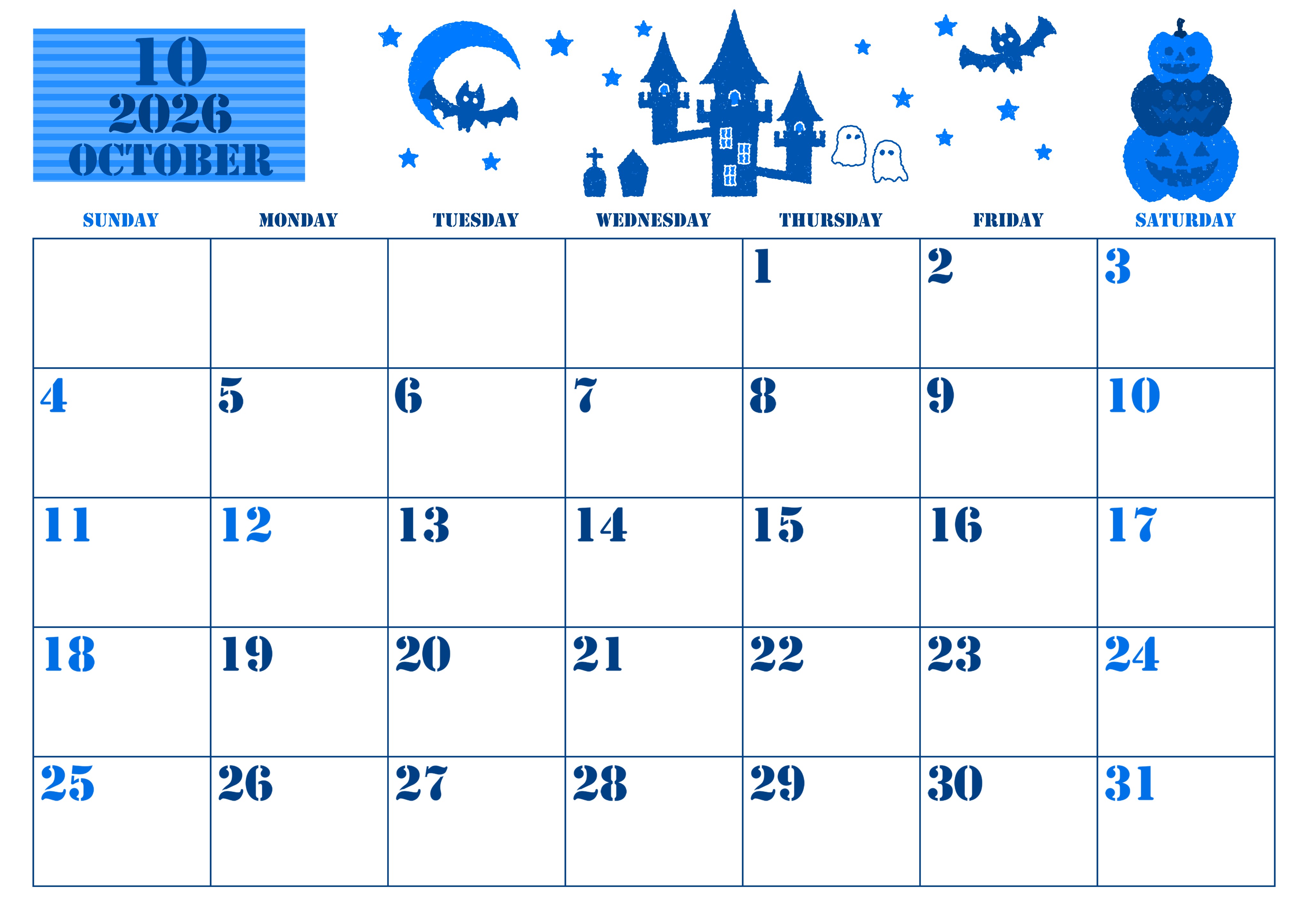 2026年・無料のカレンダーテンプレート 2026年10月横型日曜始まり ハロウィンイラストがかわいいA4無料ブルーのカレンダー(2026-00851000) 素材状デザイン王 2025年4月4日 2026年10月横型日曜始まりの無料テンプレートブルーのカレンダーです。年月の背景部分がストライプでポップです。イラスト部分もハロウィン要素がたっぷりで非常にかわいいです。(2026-00851000) 10月 横型のカレンダー 日曜始まり ブルー カレンダーデザイン-0085