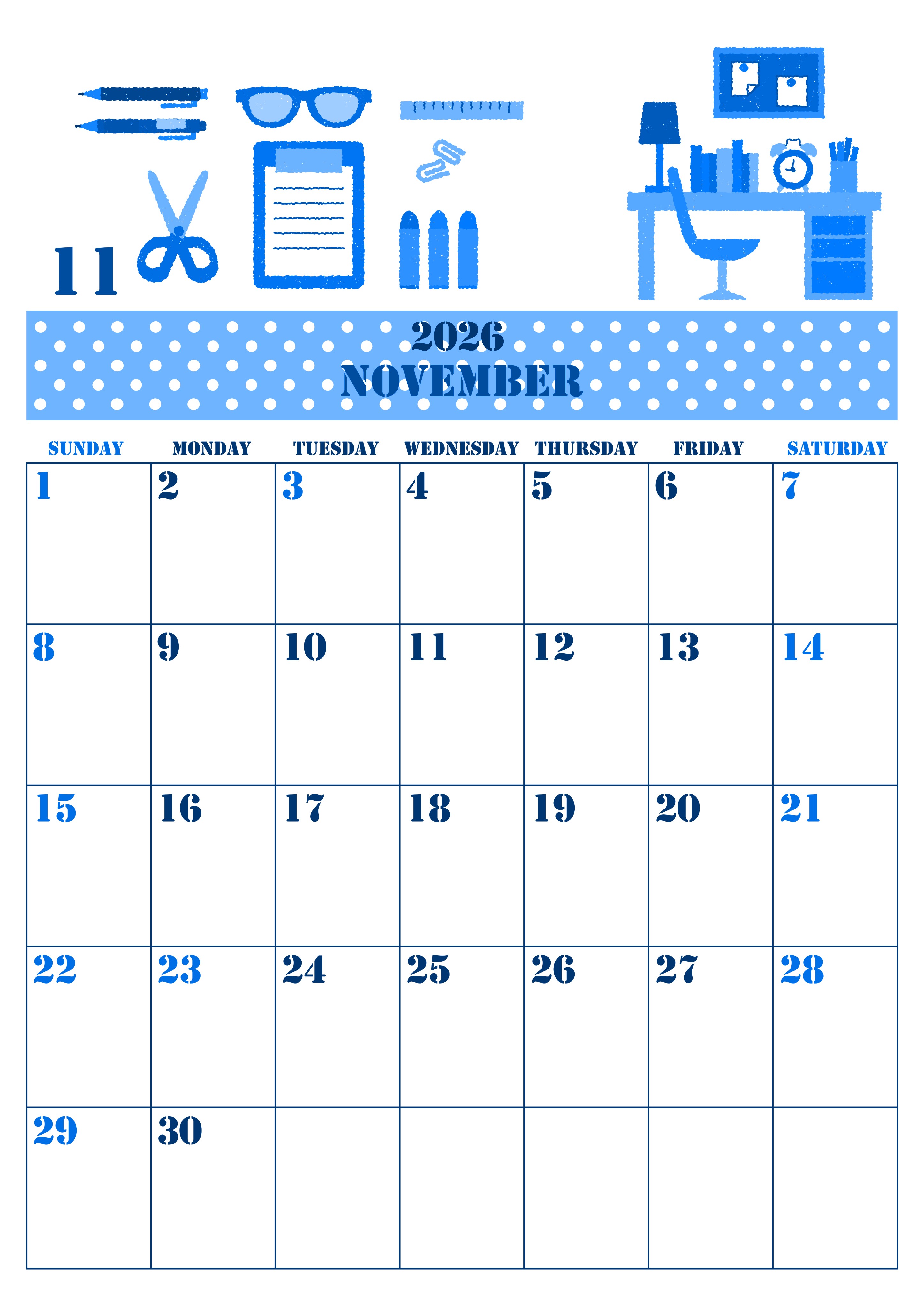 2026年11月縦型日曜始まり 文房具イラストのかわいいA4無料ブルーのカレンダー(2026-00851110)