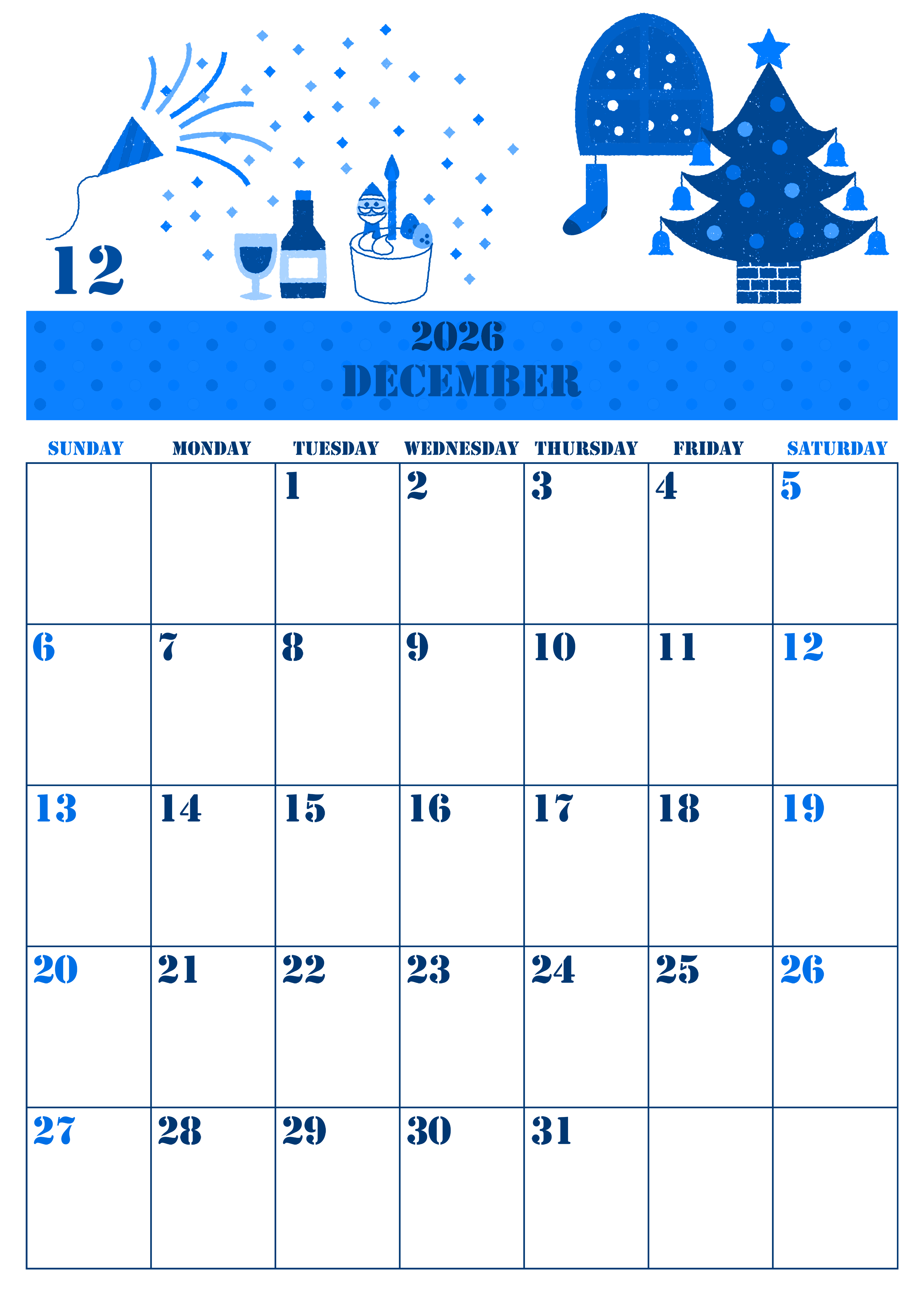 2026年・無料のカレンダーテンプレート 2026年12月縦型日曜始まり パーティーのイラストがかわいいA4無料ブルーのカレンダー(2026-00851210) 素材状デザイン王 2025年4月4日 2026年12月縦型日曜始まりの無料テンプレートブルーのカレンダーです。クリスマスツリーや靴下やクラッカーやワインといったパーティー要素がたっぷり詰まっているかわいいイラストとなっています。(2026-00851210) 12月 縦型のカレンダー 日曜始まり ブルー カレンダーデザイン-0085