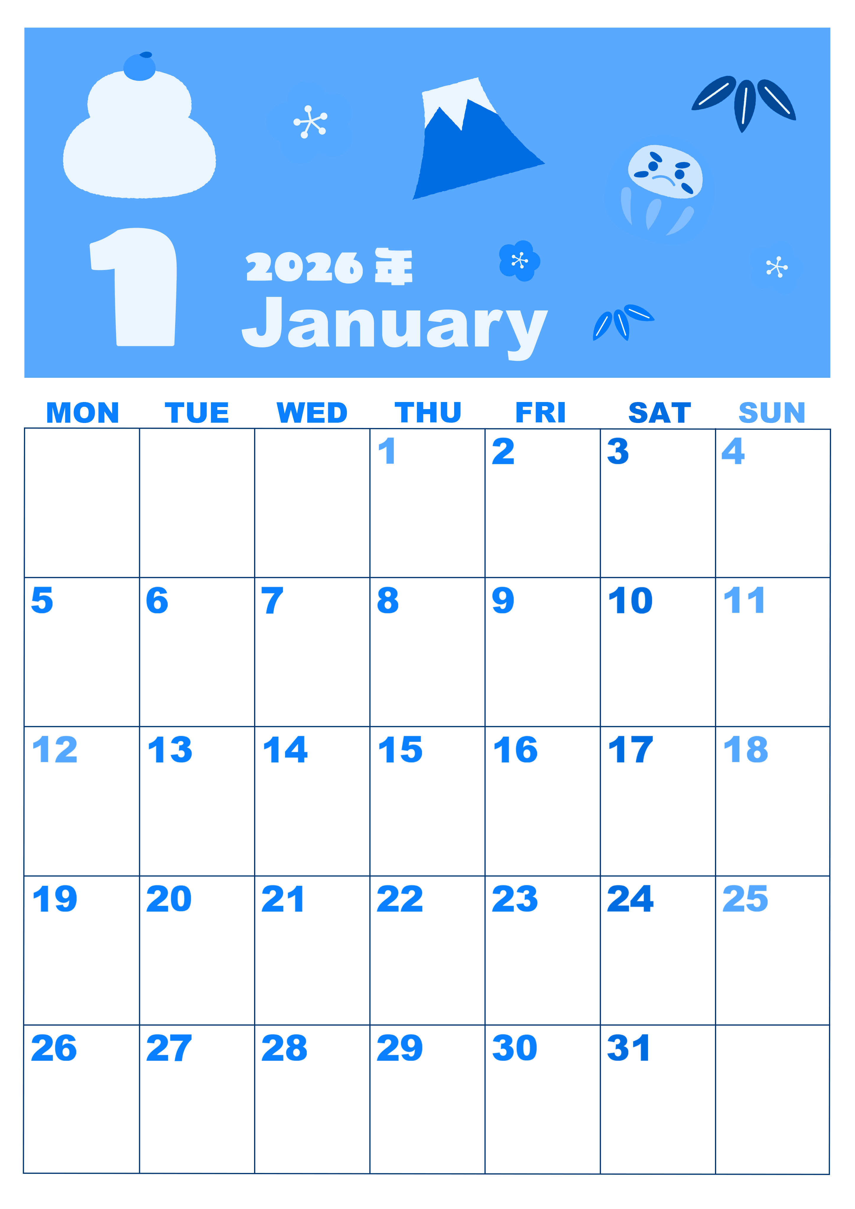 2026年1月縦型月曜始まりです。イラストは和風とかわいいが共存しています。スケジュールを書き込みする部分は白色なので使いやすいブルーのカレンダーです。曜日も色分けされていて日付の文字は少し薄い色合いとどこまでもかわいい素材なのでダウンロードをおすすめします。(2026-00860111)