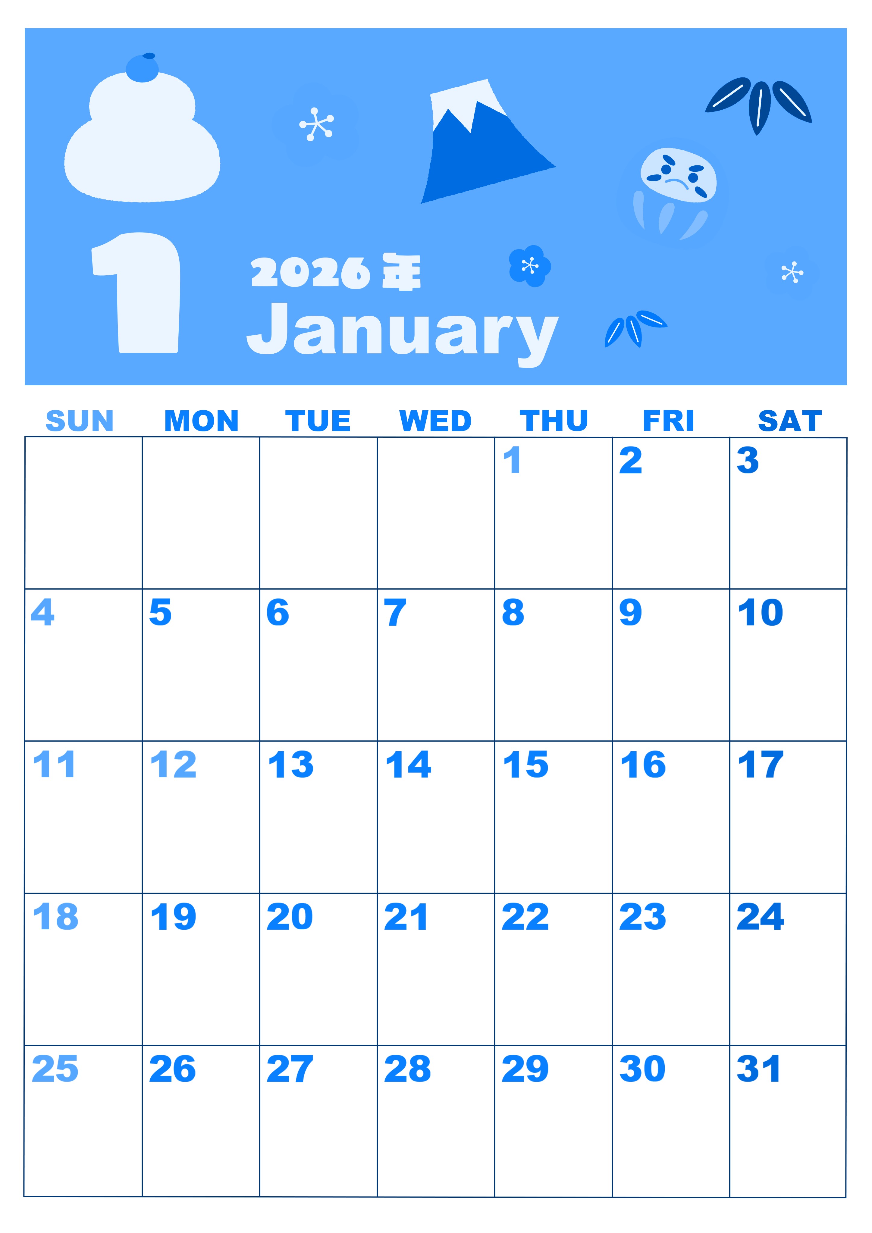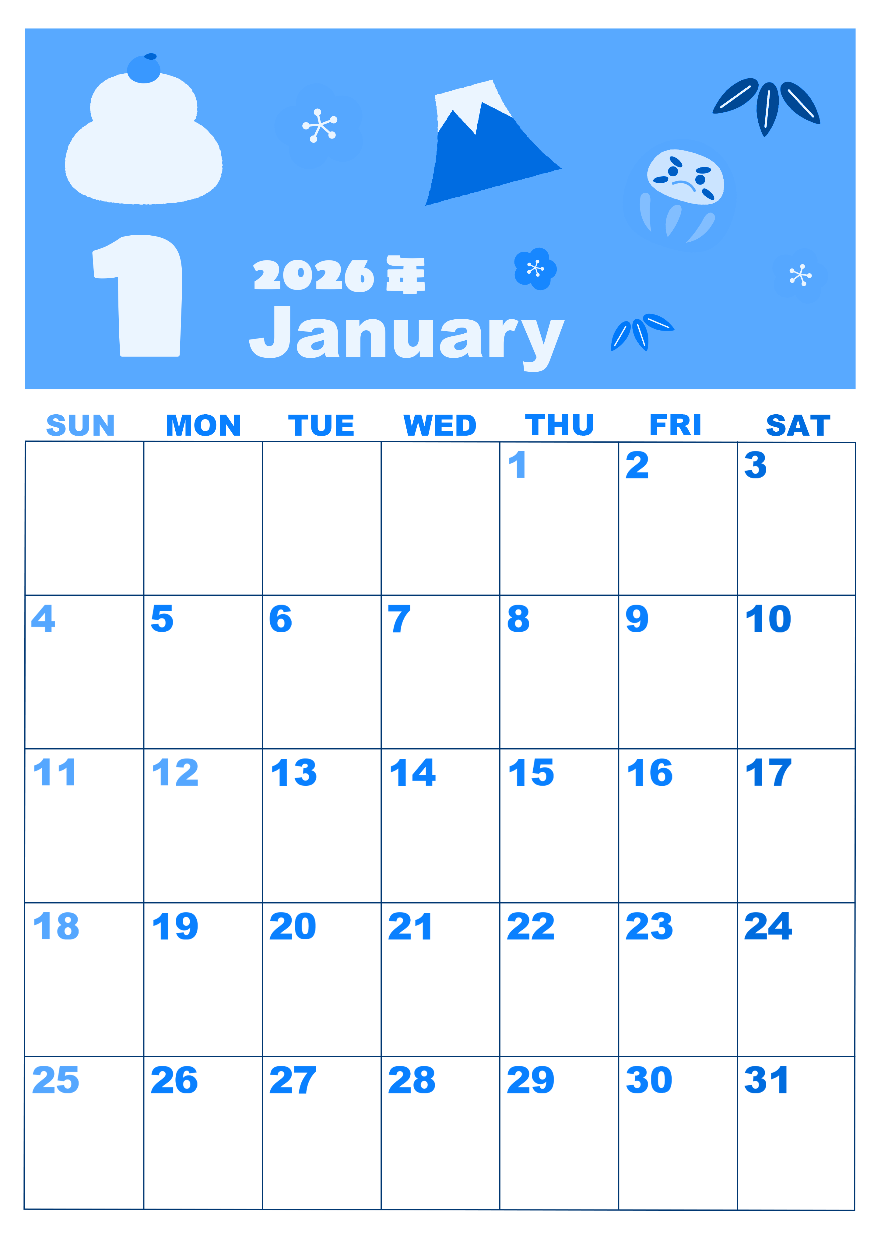 2026年1月縦型日曜始まりです。イラストは和風を前面におしているもののコロンとかわいい雰囲気を忘れていないユニークなフリー素材です。かがみもちとだるまと富士山と梅と竹と幸を呼び寄せる素材が目白押しのポップな無料でダウンロードを行えるブルーのカレンダーです。(2026-00860110)