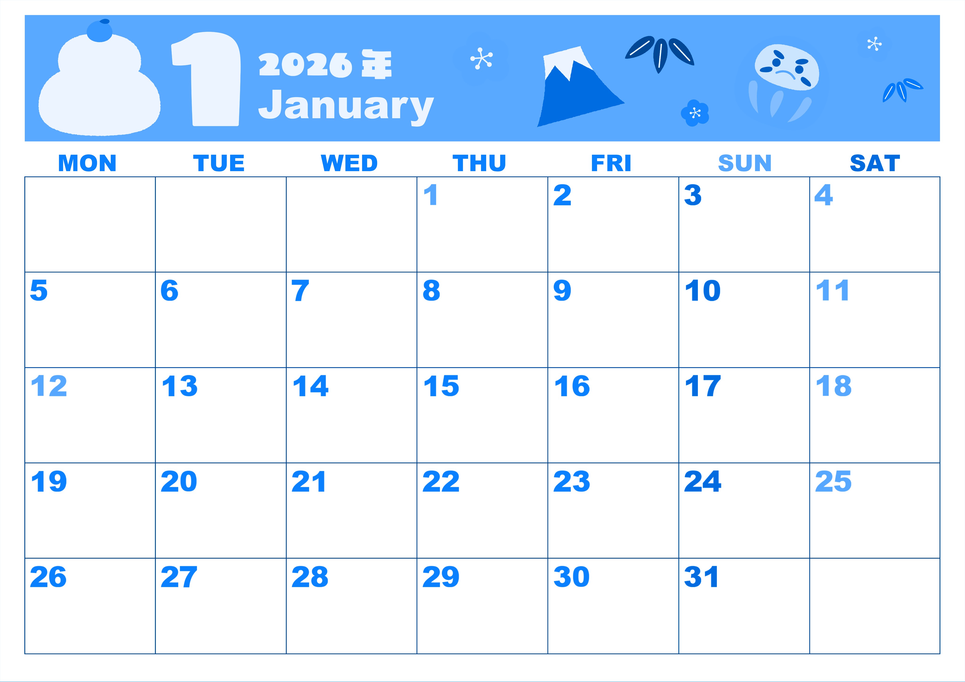 2026年1月横型月曜始まりです。イラストはレトロでかわいいテイストだけでなくどこか懐かしさも醸し出されているような画像です。かがみもちとだるまと富士山と梅と竹といずれも元旦を連想させるようなモチーフを丸っこい筆走りで描いたポップな無料のブルーのカレンダーです。(2026-00860101)