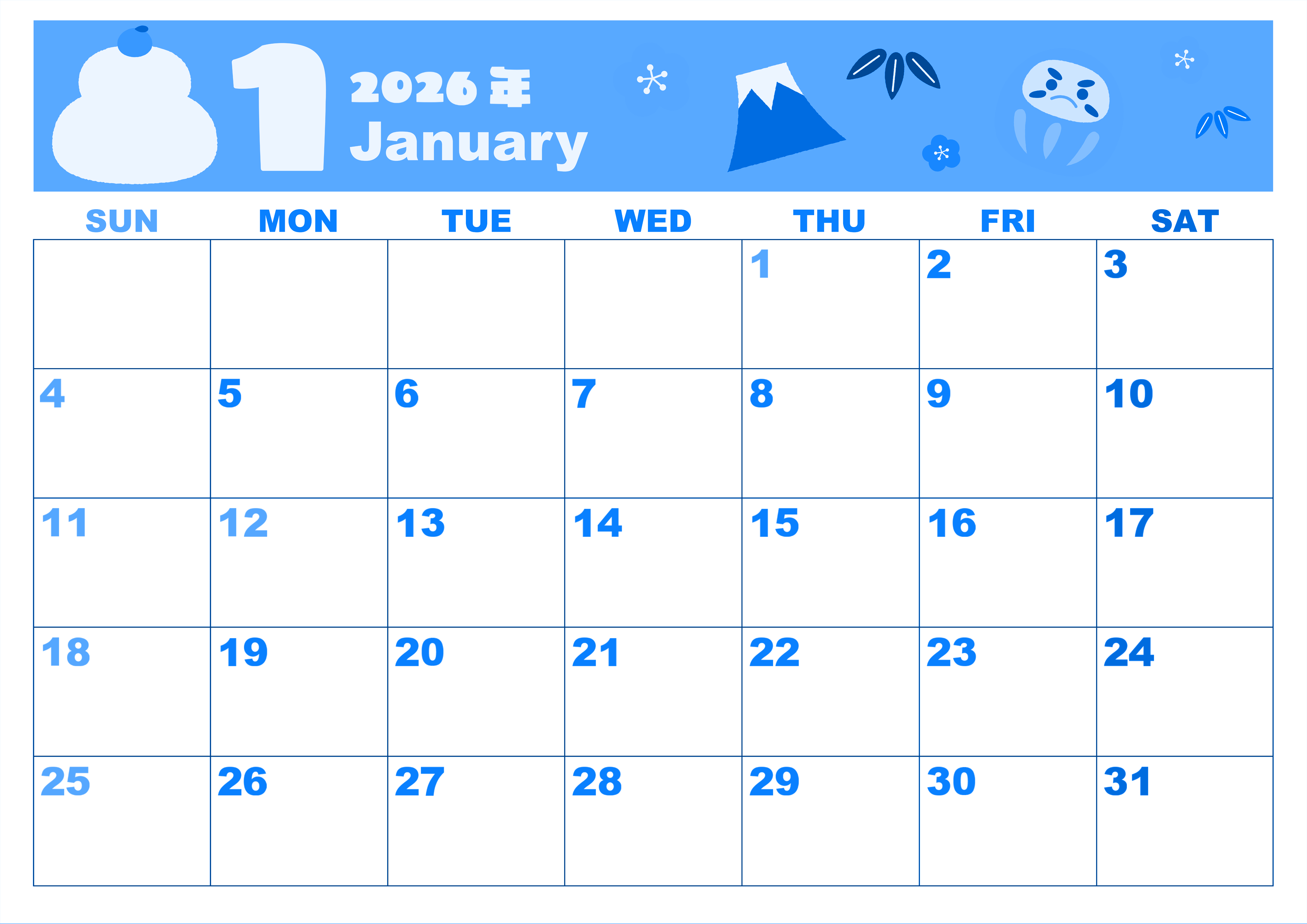2026年1月横型日曜始まり かがみもちイラストのかわいいA4無料ブルーのカレンダー(2026-00860100)
