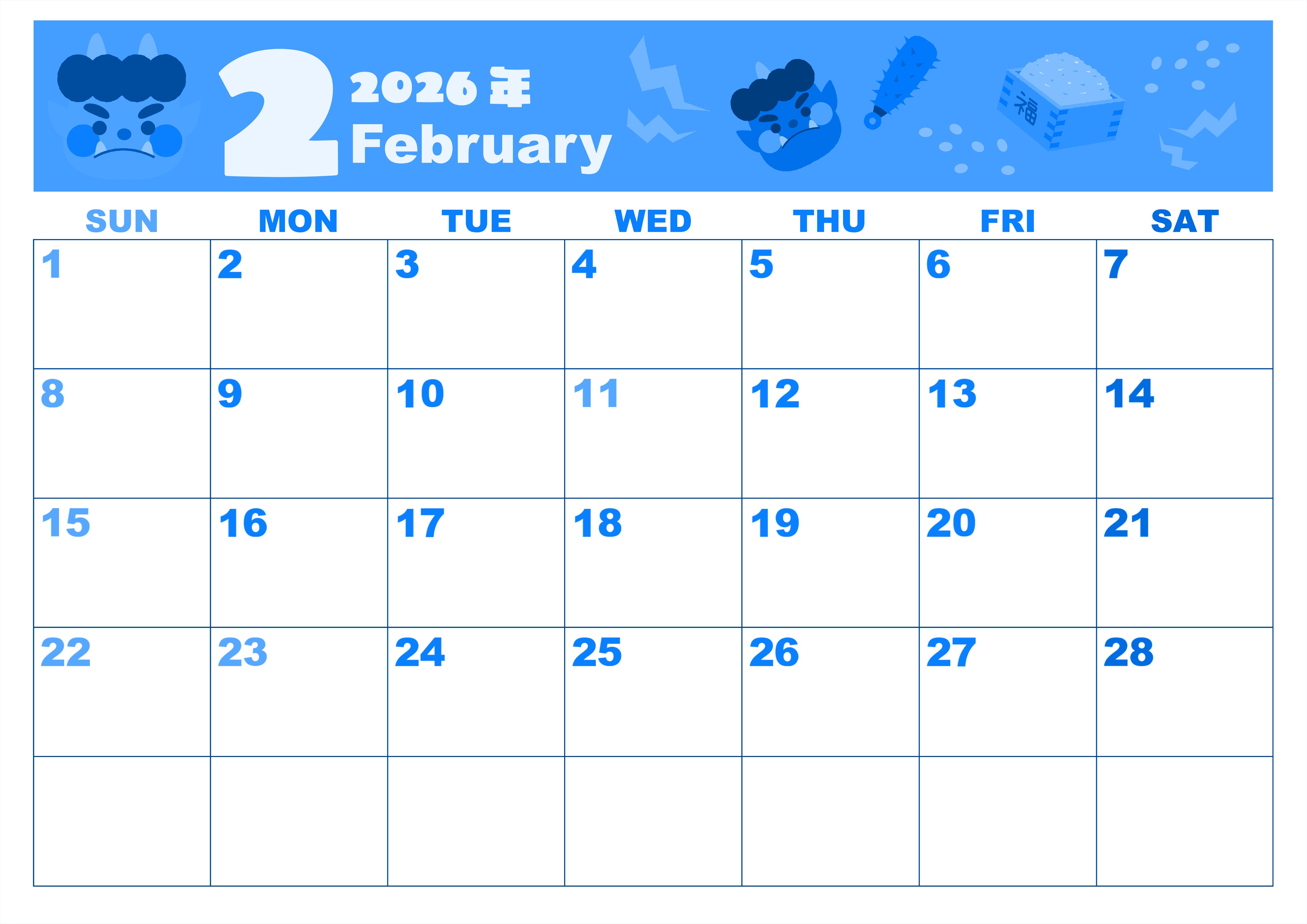 2026年2月横型日曜始まりの無料テンプレートブルーのカレンダーです。赤鬼と青鬼のかわいいイラストが主役のフリー素材です。ブルーのカレンダーとしての用途も十分に果たしており、罫線が黒色なので見やすいデザインです。(2026-00860200)