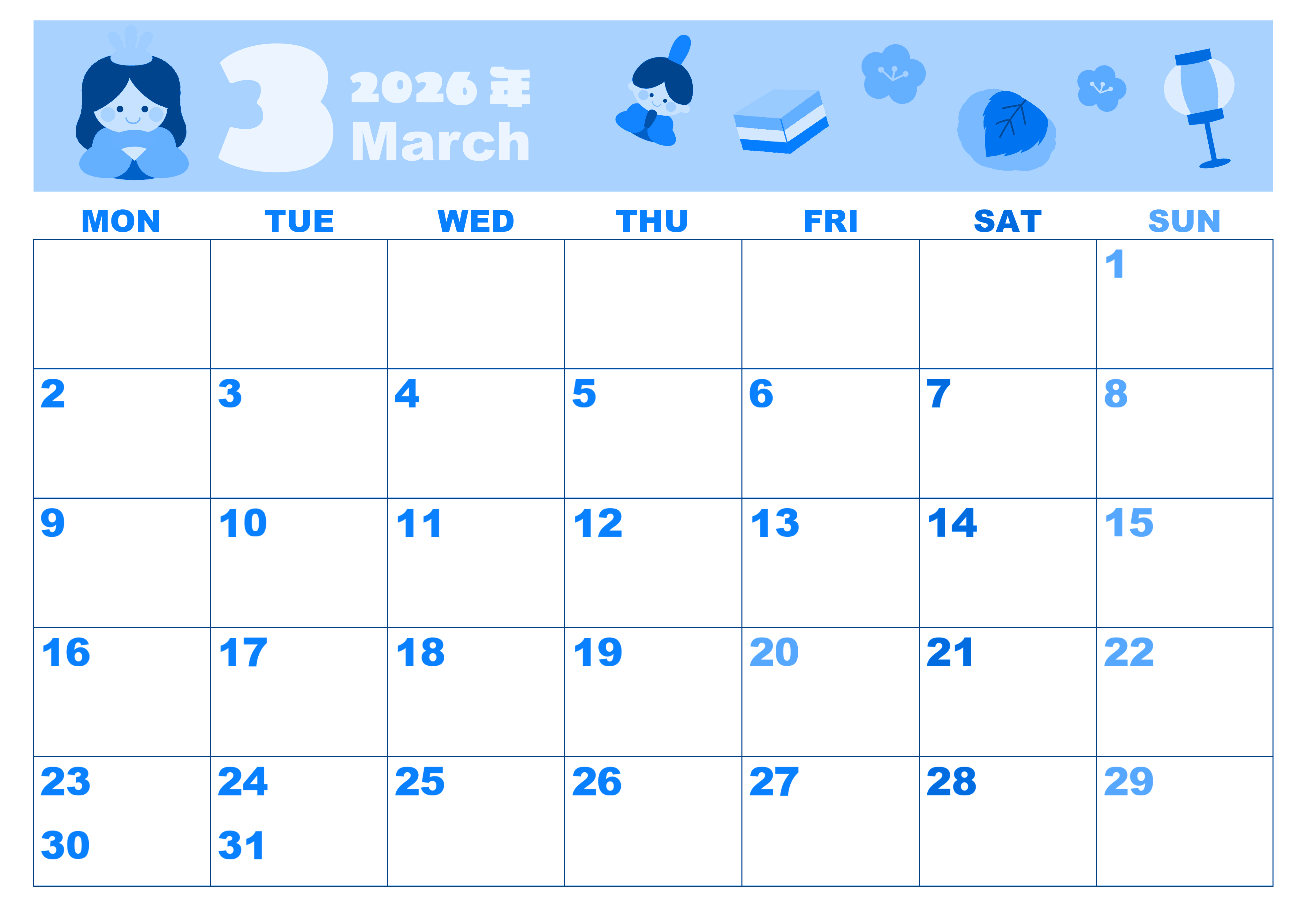 2026年3月横型月曜始まり ぼんぼりイラストのかわいいA4無料ブルーのカレンダー(2026-00860301)