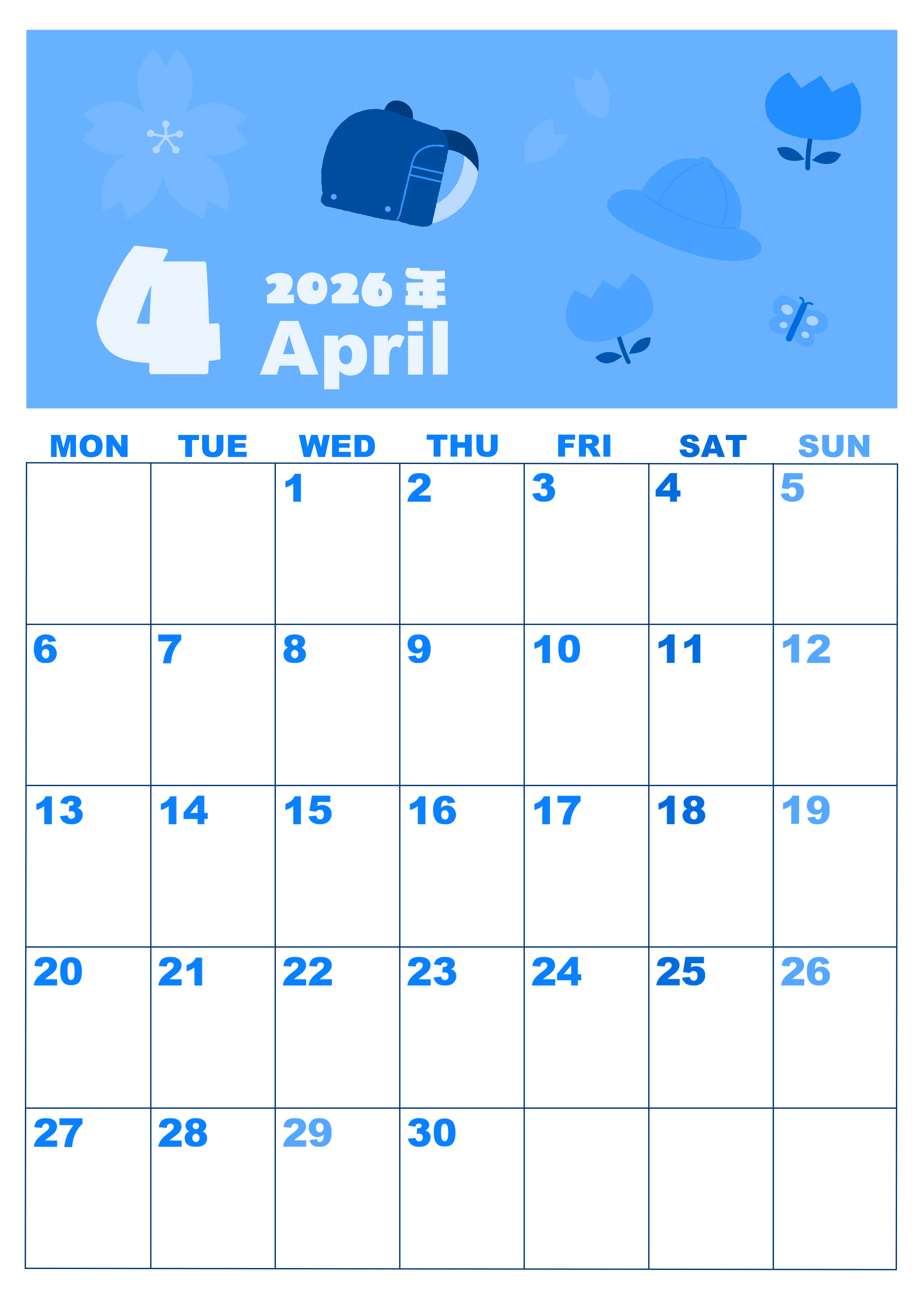 2026年4月縦型月曜始まりの無料テンプレートブルーのカレンダーです。月曜始まりで罫線もくっきりとしているのでタスク管理がとてもやりやすいブルーのカレンダーです。イラストのランドセルやチューリップや帽子もかわいいです。(2026-00860411)