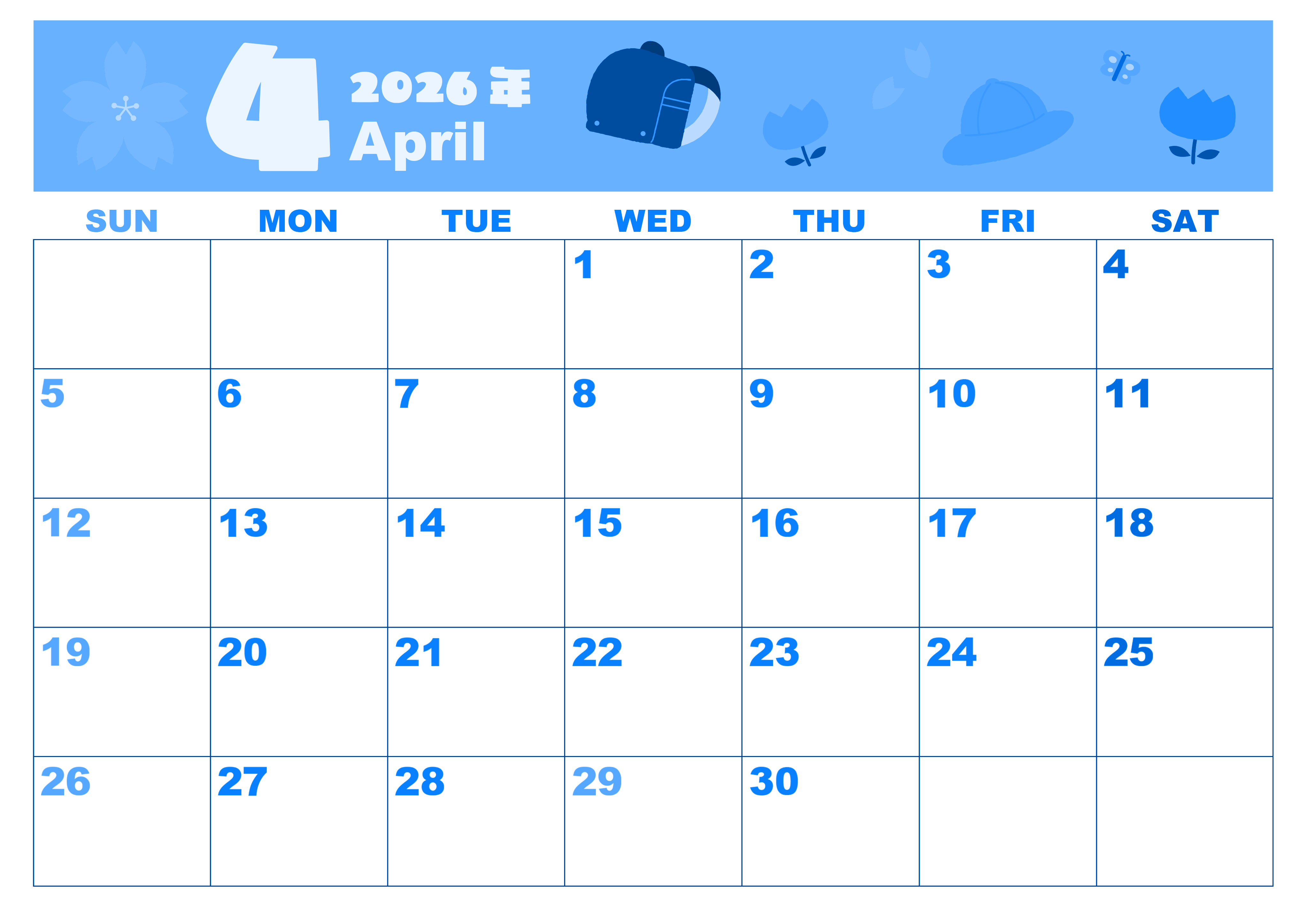 2026年4月横型日曜始まりの無料テンプレートブルーのカレンダーです。太めのまるっこい文字がとてもかわいいランドセルのイラスト付きのブルーのカレンダーです。罫線も見やすく直線なので予定を書き込みやすいレイアウトとなっています。(2026-00860400)