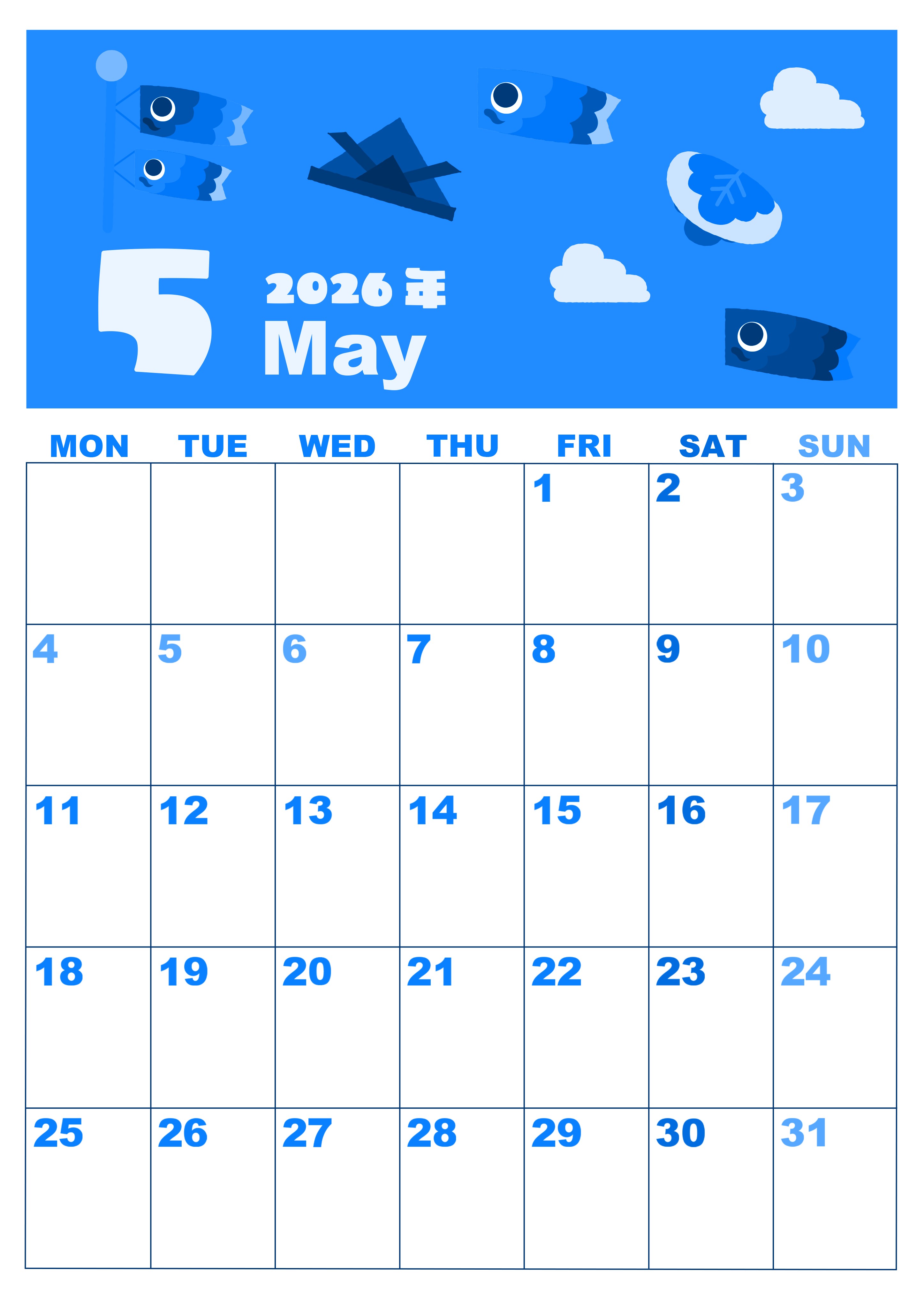 2026年5月縦型月曜始まりの無料テンプレートブルーのカレンダーです。月曜始まりのブルーのカレンダーに慣れている人におすすめの無料コンテンツです。子供の日をはじめとする行事を連想させるポップでかわいいイラスト付きです。(2026-00860511)