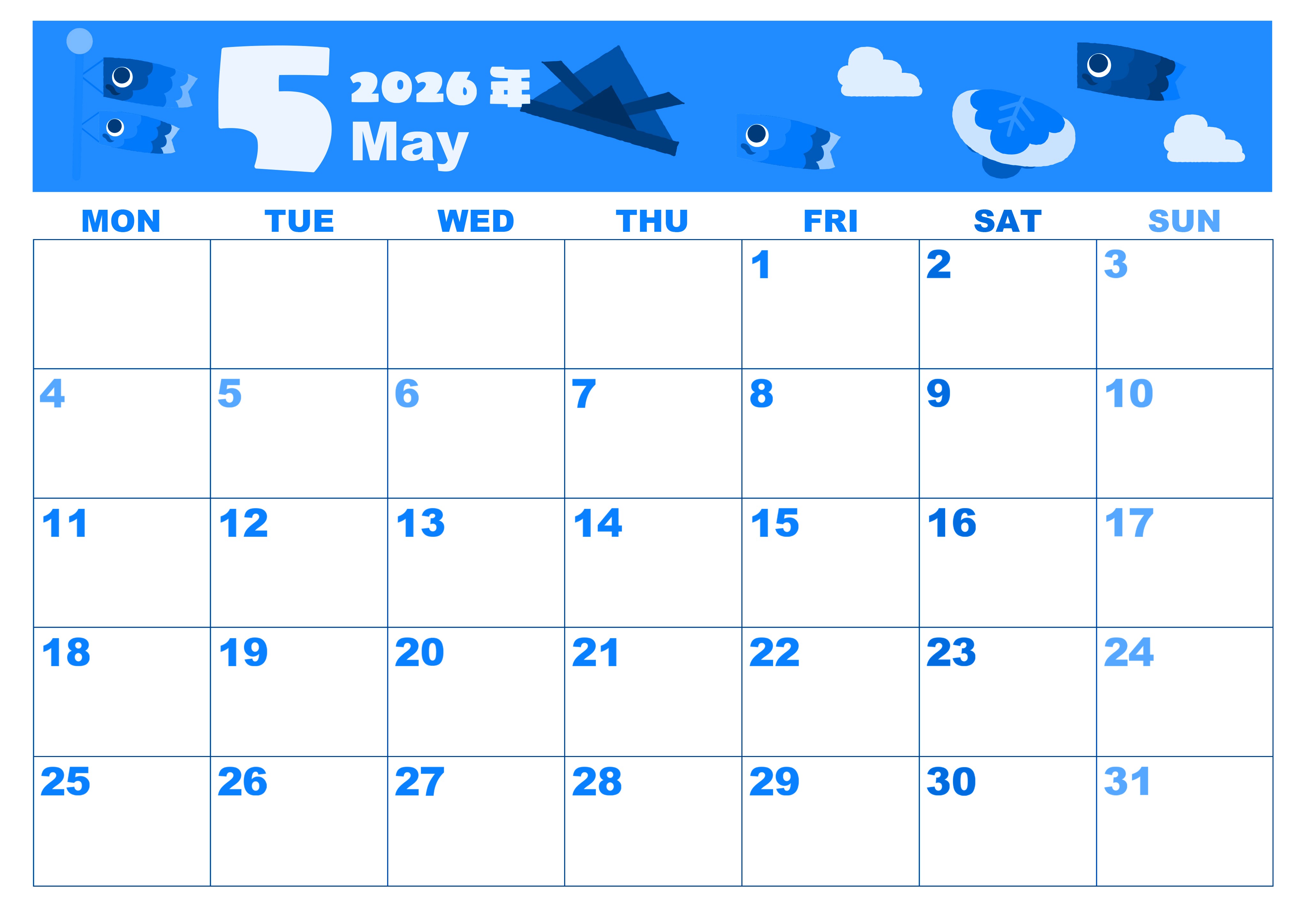 2026年5月横型月曜始まりの無料テンプレートブルーのカレンダーです。くりくりとした目の鯉のぼりが飛翔していたりと5月の行事の世界観が満載のかわいいブルーのカレンダー素材は無料でダウンロード可能です。(2026-00860501)